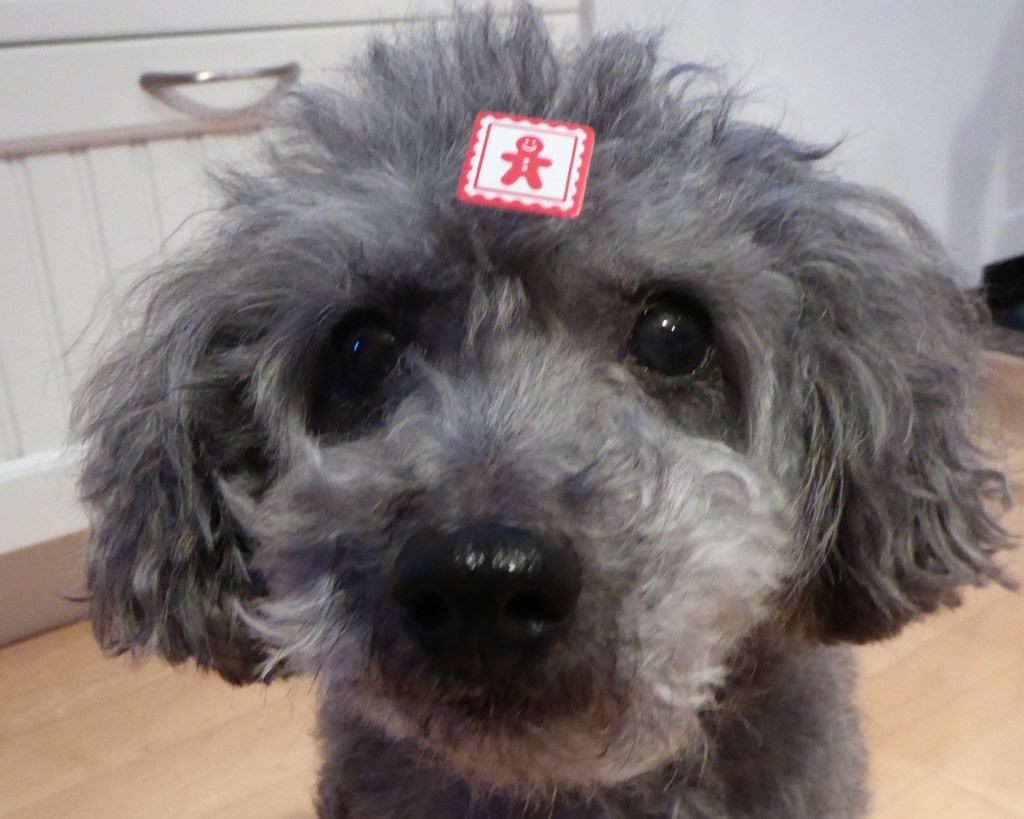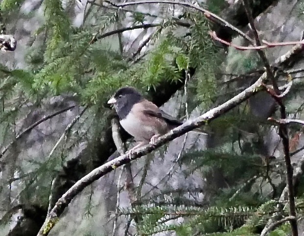 Before we left the house, Aki’s other human affixed a gingerbread-themed sticker in the middle of her forehead. This makes the little dog the most Christmassy thing today in the Treadwell Woods. She has little competition. The wood is full of hundred-foot tall spruce trees, some decorated by a flock of dark eyed junkos. Plumped up against the cold, the little songbirds could pass for Christmas ornaments. But the snow that flocked the big trees yesterday has been melted away by this morning’s rain.