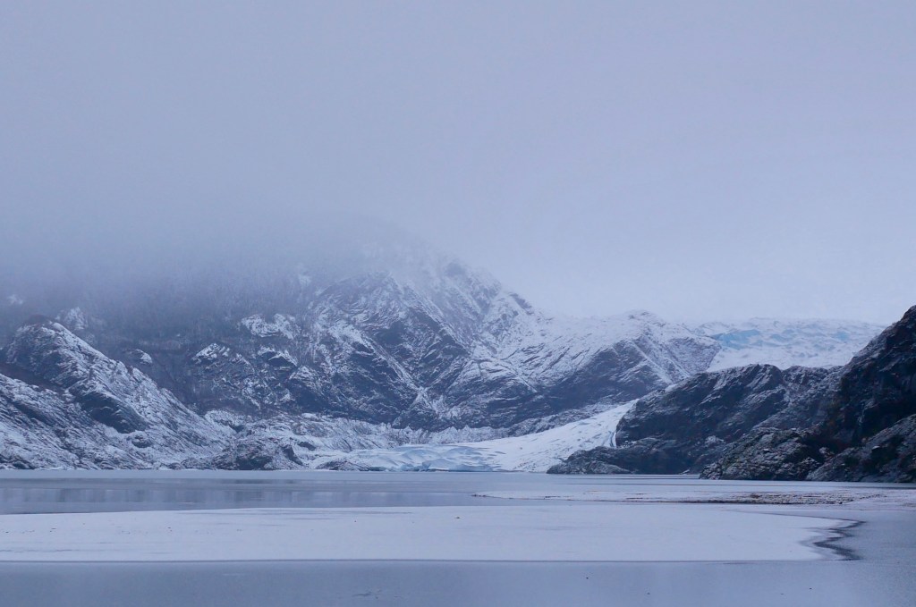 It is snaining in Downtown Juneau too, where Aki lives. But snow no longer covers the street or sidewalks. Low clouds hide Mt. Juneau and the Douglas Mountain Ridge. On the moraine we can just make out Mt. McGinnis. But the clouds hide the mountains and towers that rise above the Juneau Icefield. Snow covers much of the glacier so it glows white, rather than ice blue.