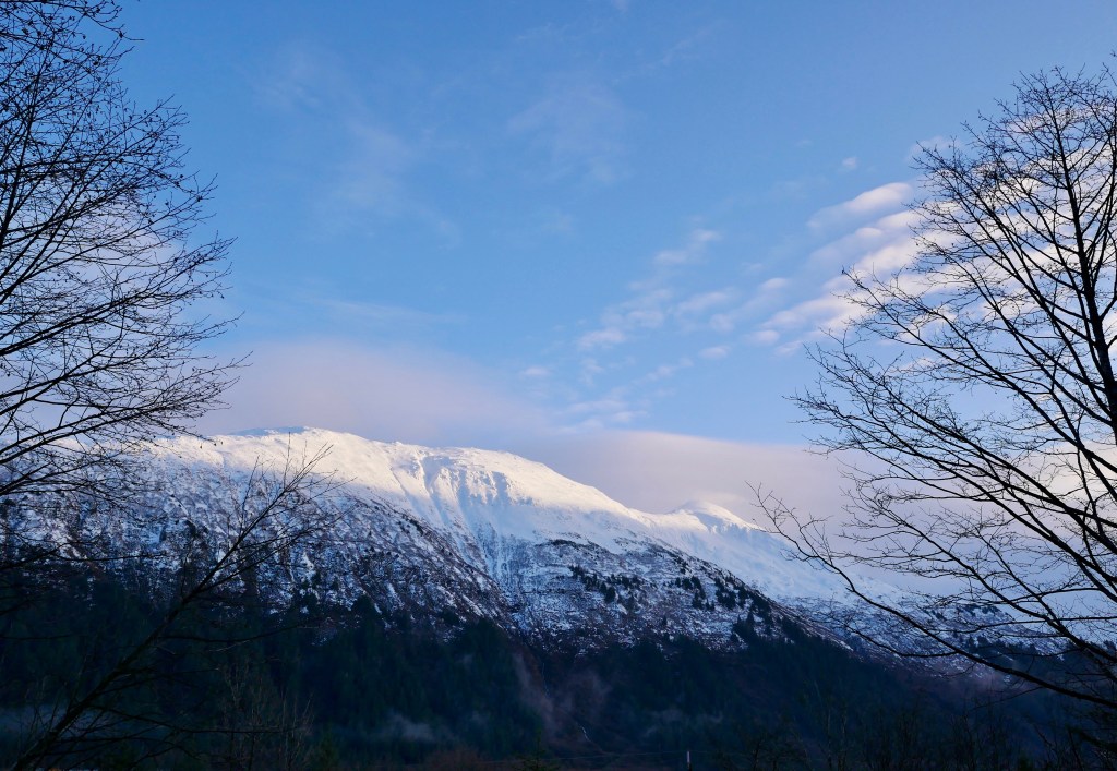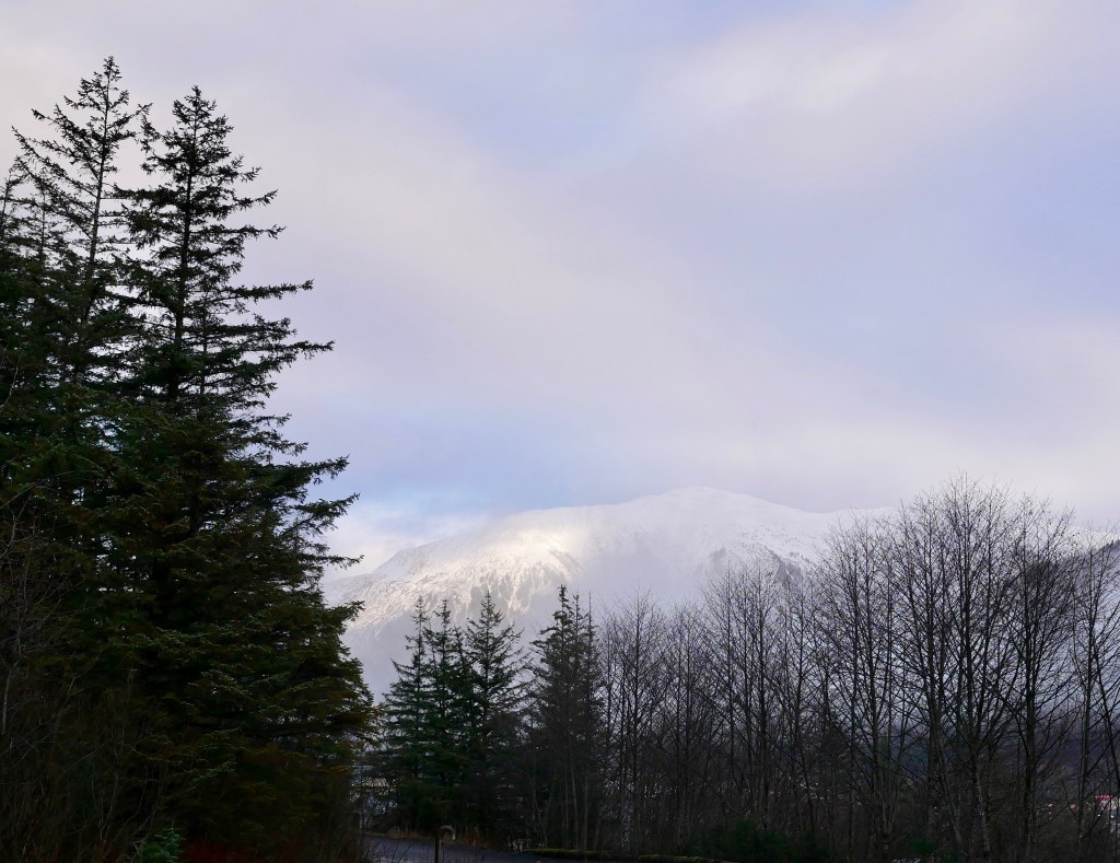 The blue hole slowly closed as we drove to the Gastineau Meadows trailhead. When we arrived, Mts. Juneau, Roberts and Sheep still glowed white across the channel. Now they have returned to rain forest gray.