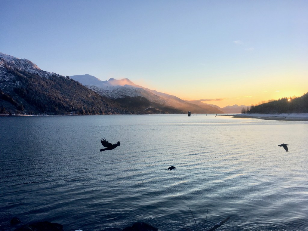 The meadow is as gloomy as the trail when we reach it. My eyes are drawn to the surrounding mountains that reflect back sunshine thanks to their fresh covering of snow. Aki barks and charges ahead to greet a hiker descending the trail. Since she is warm enough to wag her tail, she will be okay.