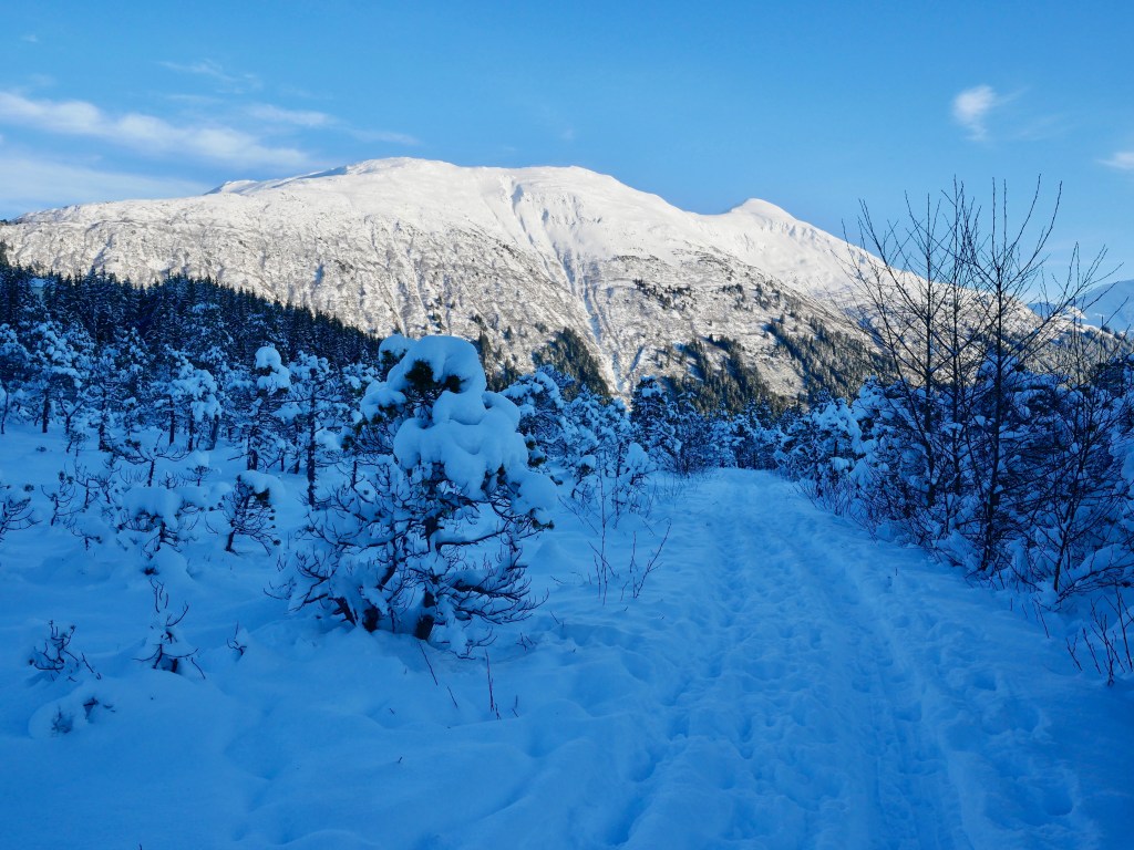 Aki and I waited for the heat of the day to hike up to Gastineau Meadows. I warmed up quickly as I trudged up the snow-covered trail. Since the diminutive Aki floated over the snow, I worried that she might not generate enough heat to stay warm. Sunshine would have helped. But this time of winter, the sun won’t reach us here. Good thing the expect wind storm has been delayed.