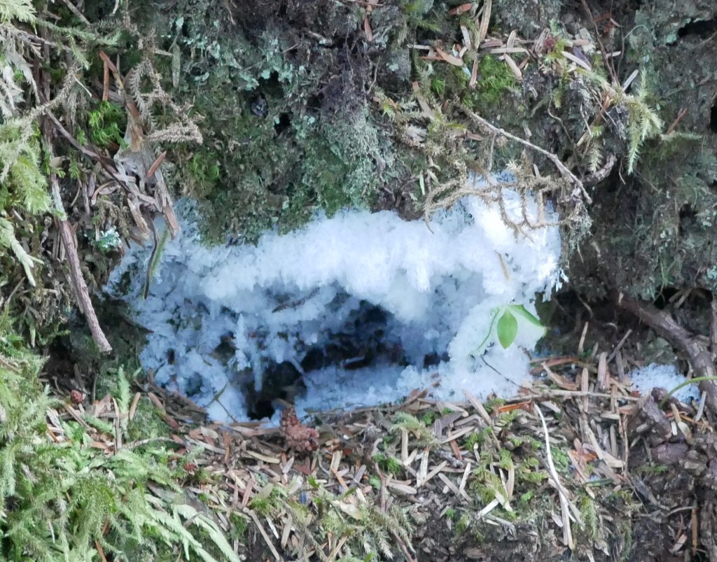 Similar frost borders mark the sleeping places of the other squirrels in the woods. Up near the forest canopy, a wood pecker climbs an old growth hemlock but does not make a noise. Two Steller’s jays land on a close-in tree limb to silently watch us pass.
