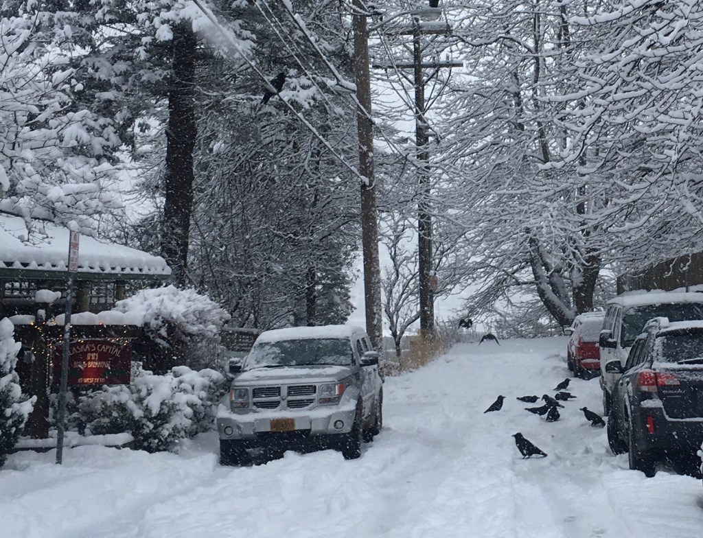 Seeing the ravens feeding on something the color of human blood reminds me that in addition to being clowns and tricksters, the big birds are voracious, sometimes scary scavengers. Days later, across from Perseverance Theatre, I stumble on another gang of ravens. Hours before city ploughs had cleared away snow that cheated theatre goers of needed parking spaces. They must have stirred up something tasty.