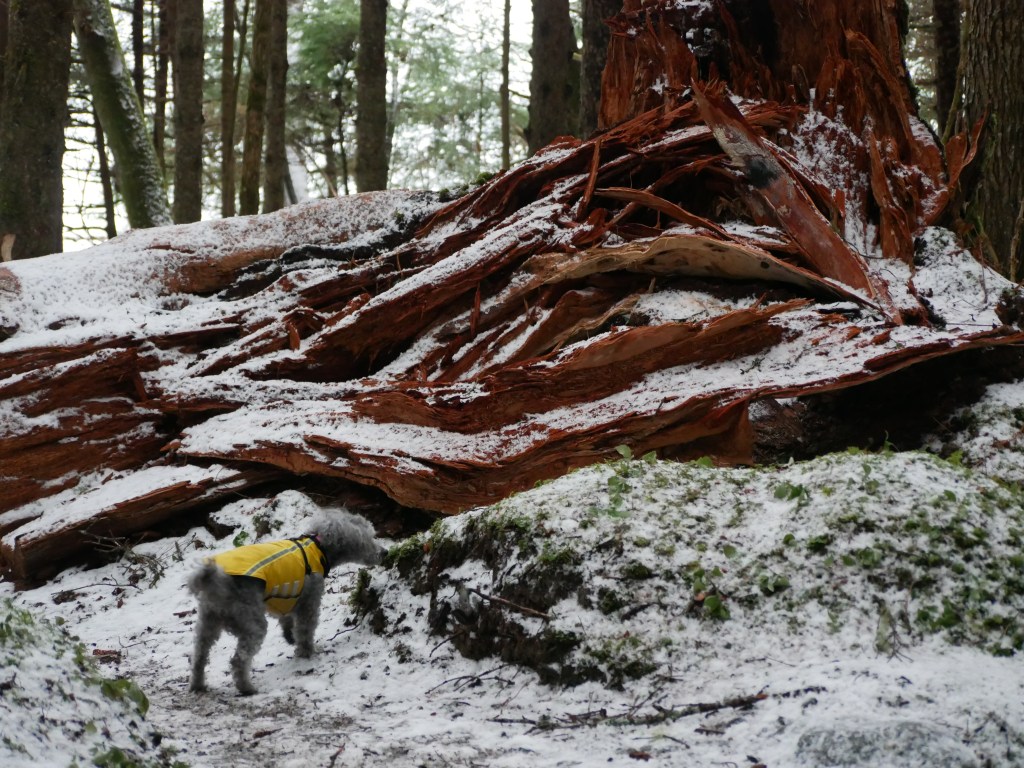 It was to be our first walk since my return from the north. It blew 90 knots the last time we walked together. Aki must have expected more of the same today. She shivered while we drove out to trailhead even as hot air from the car heater blew on her. Her mood changed when I parked. She squeaked and leaped onto the snow-covered ground. High winds and cold forgotten, she trotted ahead of me down the trail, tail a metronome.