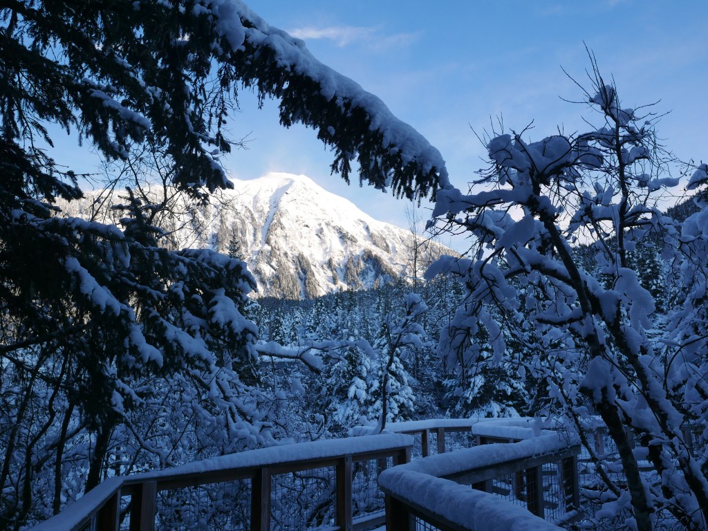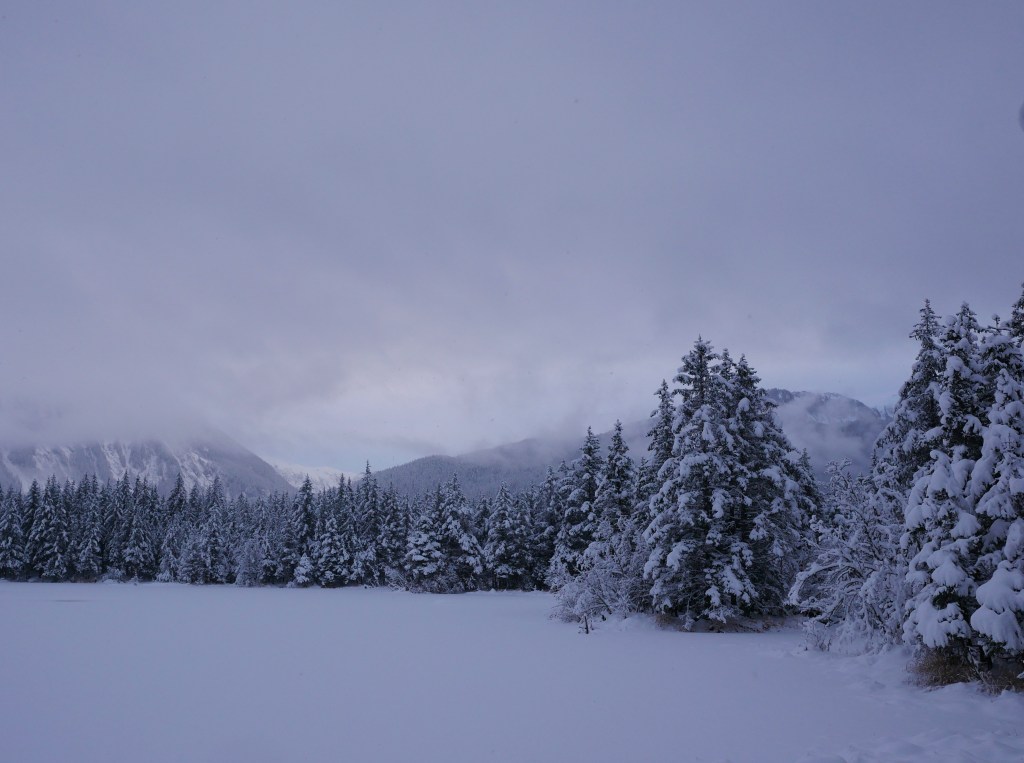 The meadow is as gloomy as the trail when we reach it. My eyes are drawn to the surrounding mountains that reflect back sunshine thanks to their fresh covering of snow. Aki barks and charges ahead to greet a hiker descending the trail. Since she is warm enough to wag her tail, she will be okay.