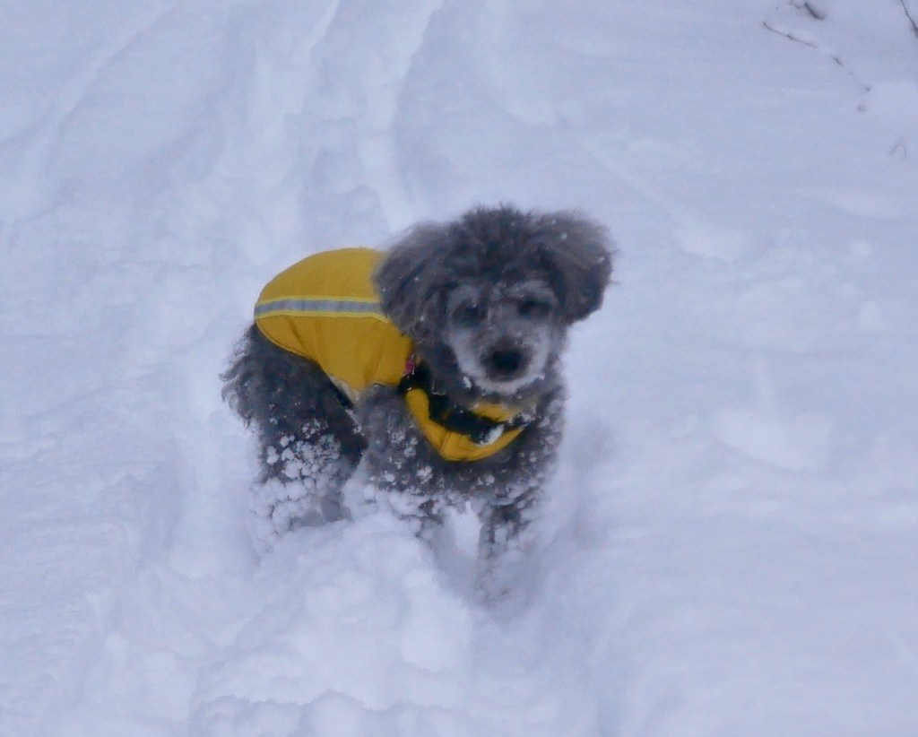 The little dog squeaks and squeals like she usually does when I open the car door. She leaps out and onto the snow-covered pavement. I have to trot quickly to catch up with her on the trail. As I fasten the chin strap on my mock-fur hat, Aki moves into deep snow and starts the peeing ceremony. She is still circling as I move down the trail, confident that she will soon catchup.