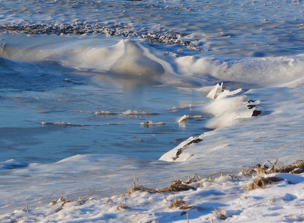 As the wind numbs my face, I lose interest in slipping and sliding down the creek mouth. I turn back, followed by a now energized poodle-mix. We work our way back to the trailhead. When we cross the creek bridge, I expect to see the ice breaking up under pressure from the incoming tide. It still holds firm. Fifty meters up stream three river otters slink onto the ice. One by one they dive into the ice-free rapids. We are such cold weather wimps, little dog.
