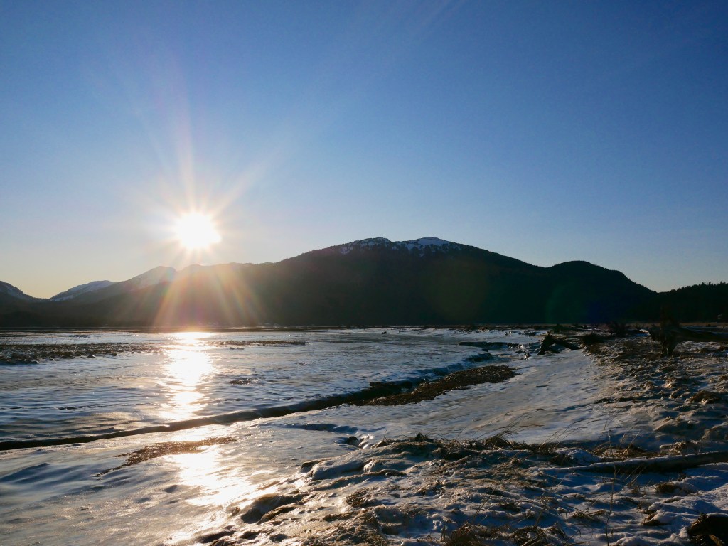 I carry the chilled old dog to our car and take a solo walk to the now-frozen Mendenhall Lake. While I take a picture of the surrounding mountains, a father and son approach a stream diminished by the cold to a trickle. Both are wearing rubber boots. The dad splashes across but the son hesitates. He is already cold and doesn’t want to be colder. The dad offers to give him a piggyback ride back to the heated visitor’s center after he crosses the stream. The boy does, then climbs onto his father’s back.