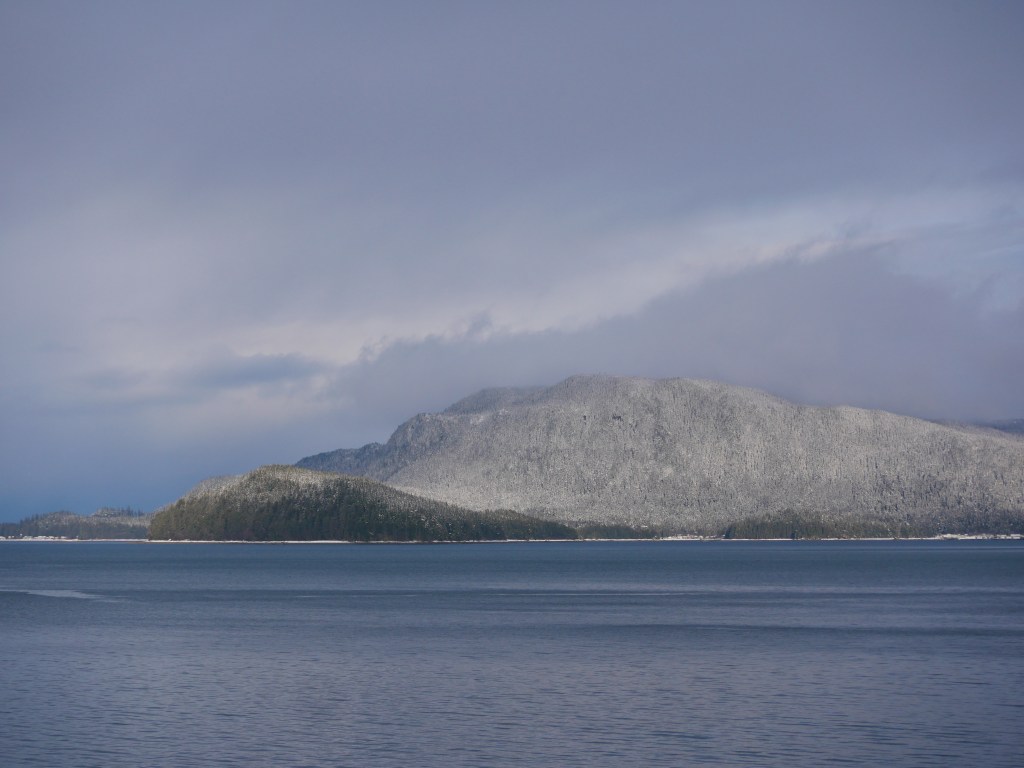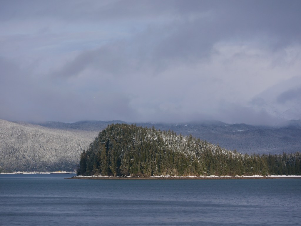 The little dog froze when we reached the open wetlands. She stared as I post-holed out to Gastineau Channel. The sky over the wetlands was confused. The south view was socked in by snow clouds. Sunshine flooded the northern view. But the sunny area shrank as I watched, consumed by another advancing storm.