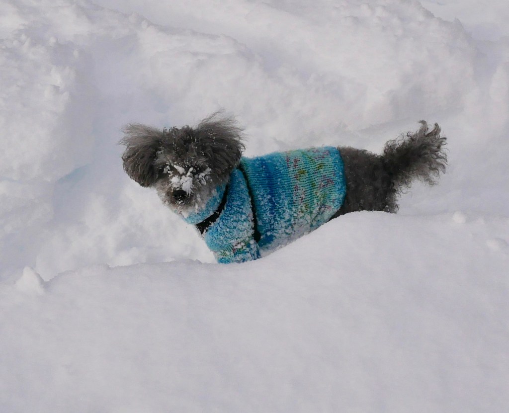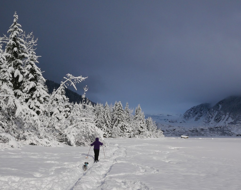 Yesterday’s storm left Mendenhall Lake covered with a half-a-meter of snow. Aki can’t handle such deep stuff without some help. She gets it from her other human and I. We ski ahead, packing down a trail for the little poodle.
