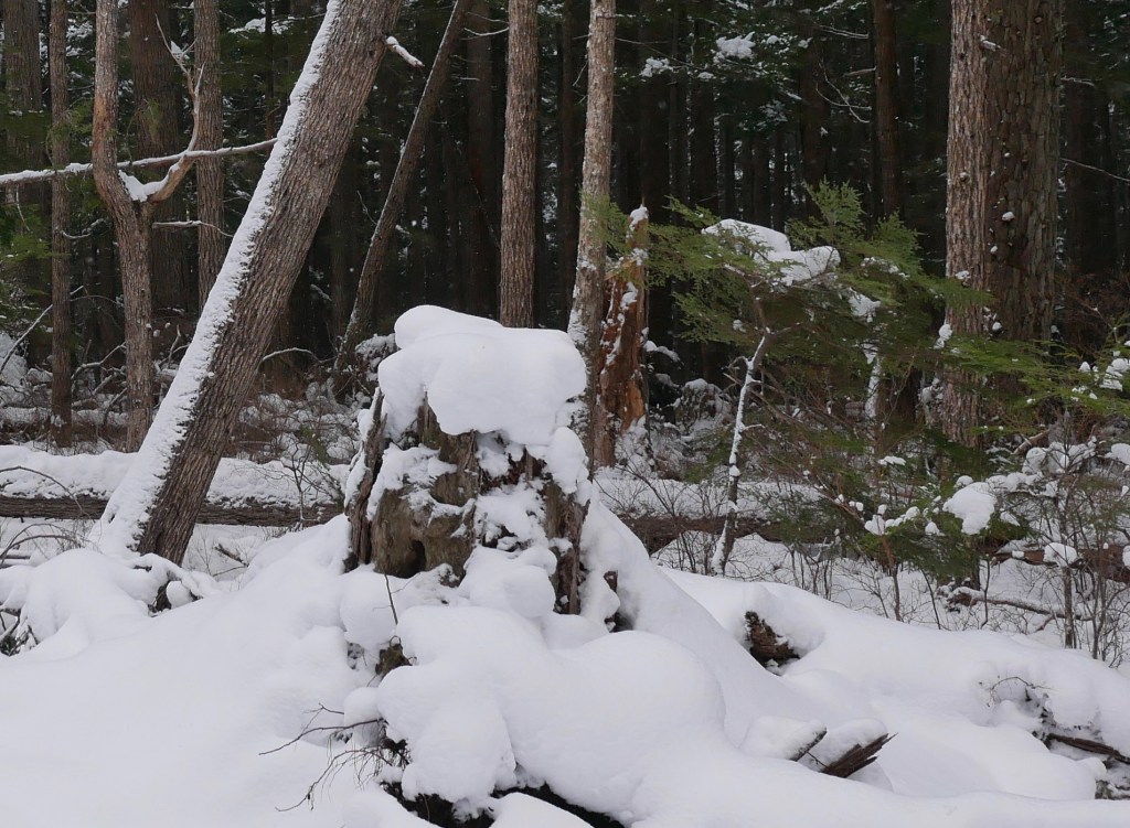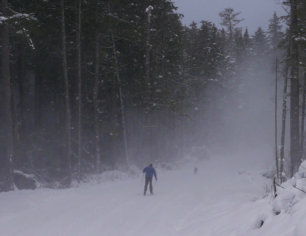 This is the first time we have skied on this pioneer road. In summer it is just a gravel gash through three and half miles of spruce forest. Buried in snow, like it is today, it offers a chance for silence and solitude. Walled in by forest on both sides, the road doesn’t distract, permits my mind to wander, to eventually sink into a calm catch basin. I am almost there when the wind rises to chill me and blow snow off the spruce tops. I am surprised to find myself welcoming the drama of blowing snow.