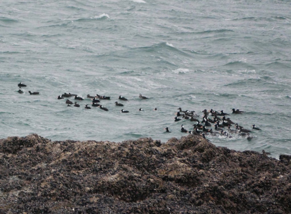 Coming off the glacier, the wind rips across the spit, stopping Aki in her tracks. I have to carry her to the little spruce grove at the end of the spit. Instead of resting in the lee of the spruce, the little dog racing over to an exposed clump of beach grass and sniffs. While she checks the Point Louisa pee mail, I lean into the wind to close on the point where a small raft of scouters is weather veining into the wind.
