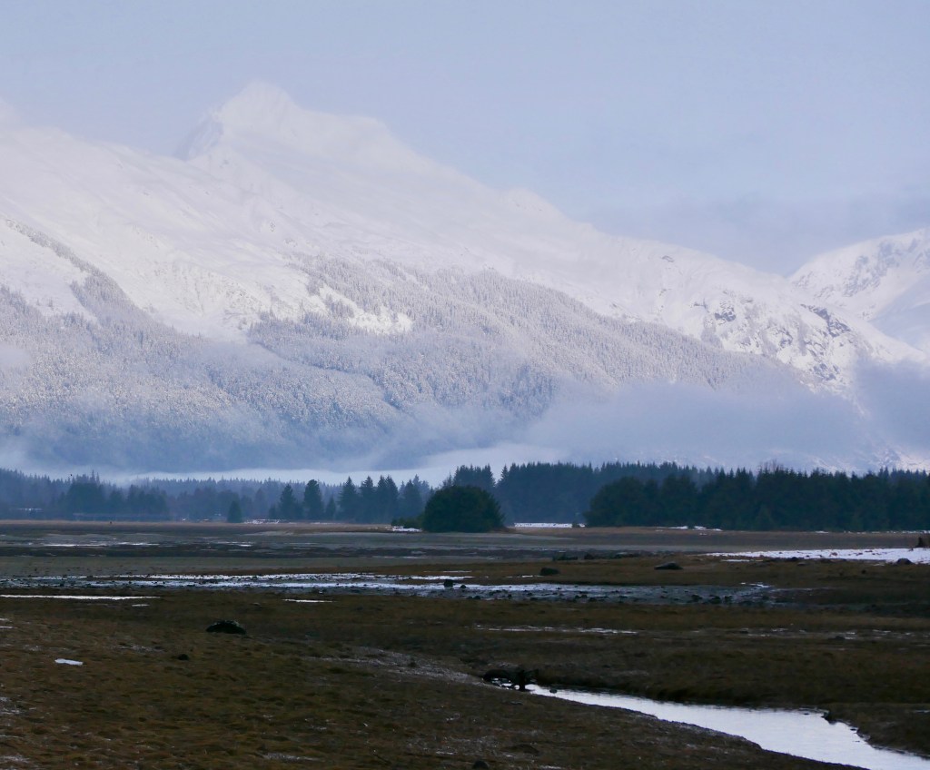 I don’t expect much drama today. It’s low tide so we would have to cross a wide stretch of empty wetland to reach the waters of Fritz Cove. That’s where the ducks hang out and at least two bald eagles. Snow clouds obscure the glacier and surrounding mountains as we near the creek mouth. But, as we turn back to the trailhead, the clouds thin. Weak sunlight strikes the mountains, giving them a pearlescent glow. Then the clouds return.