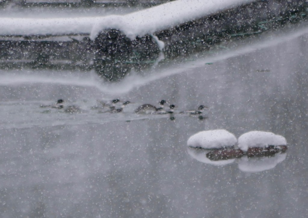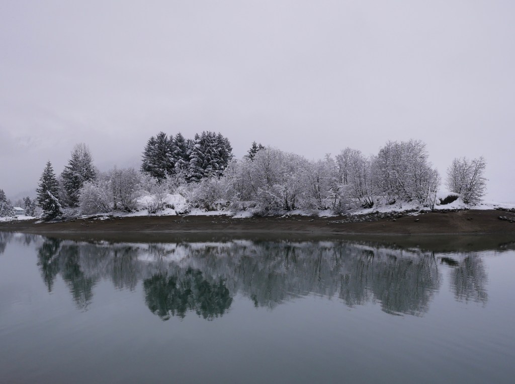 At the end of yesterday’s ski, Aki was weighed down with snow balls. They clung to her curly leg fur. Wanting to protect her from a similar debacle, I chose a well-trodden trail for today’s walk. The trail crosses the Mendenhall River wetlands. On clear days you can see a glacier and the mountains that it sculpted. Today snow clouds have reduced the view to the near wetlands.