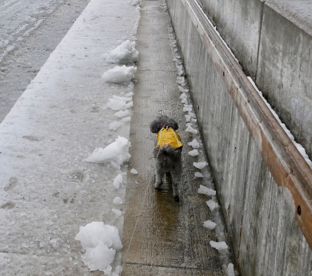 Unfortunately, Aki still needed her walk. The little dog was all innocent excitement while being dressed. She charged out the door, took a few steps in slushy snow. 7 cm deep, and stopped dead. She would have gone back inside if I didn’t coax her out into the street. There she could walk in wet, but not slushy tire tracks.