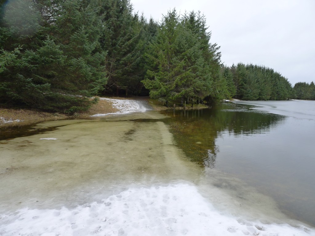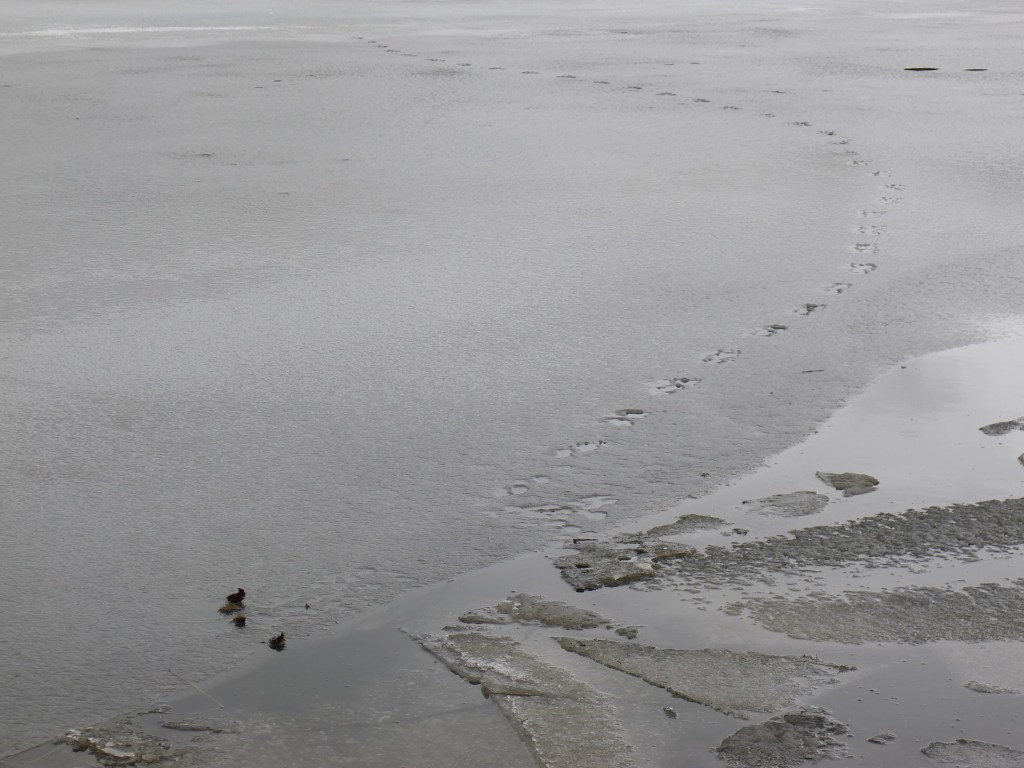 We walk around the pond, stopping to puzzle over a curling line of otter tracks made in the deteriorating pond ice. Three islands of poop mark the beginning of the track line, sitting on pillars of ice four or five centimeters tall. The scat must have sheltered the ice beneath it from eroding rain. Now each piece of otter poop sat atop its own Eddystone rock, marking the otter’s passage.