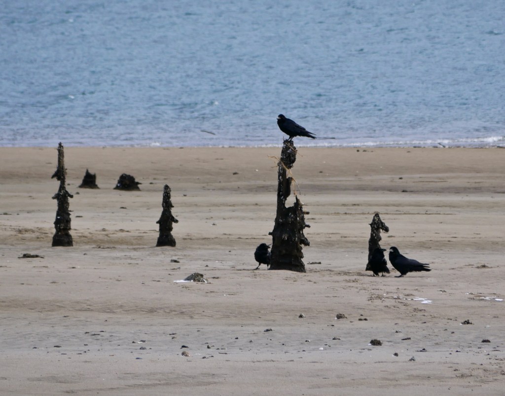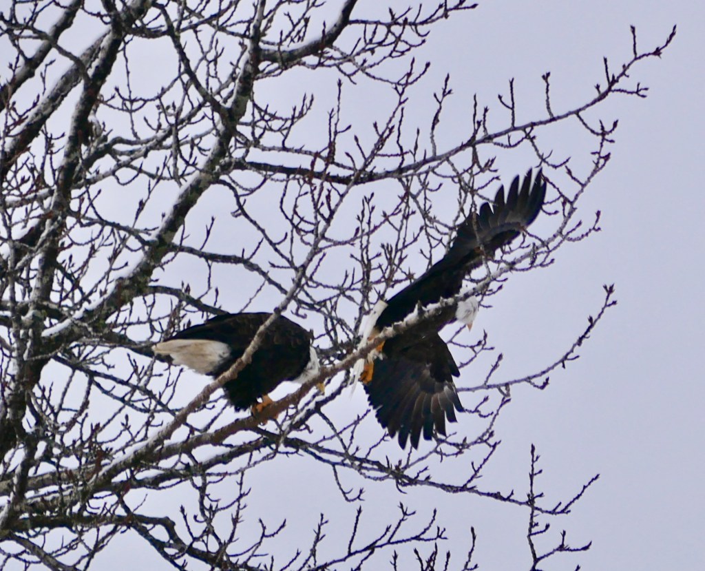 The tide is out at Sandy Beach. A pair of adult bald eagles are hunched in the branches of a tall cottonwood tree. The stiff breeze powers through their neck feathers, giving each a bald spot. If the eagles turn around, they could watch convention of ravens convening near the waterline.