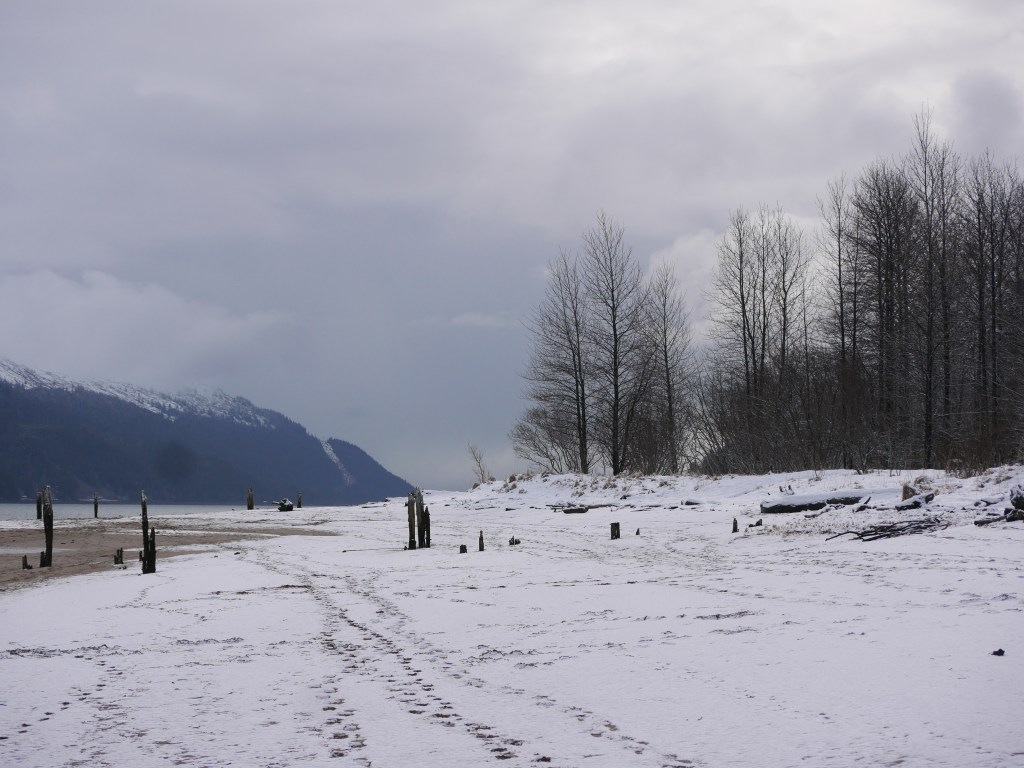 Several inches of new snow brighten the beach above the high tide line. The snow is dimpled by the prints of dogs and their humans. A raven flies toward Aki as she investigates a promising set of prints. It flies low over her head. The startled dog leaps in surprise as the raven circles her and lands two meters away. Is this the same raven that tries to play tag with the poodle-mix at Sheep Creek? If not, work must have gotten out in Raven’s ville that Aki is quick to take the bait.