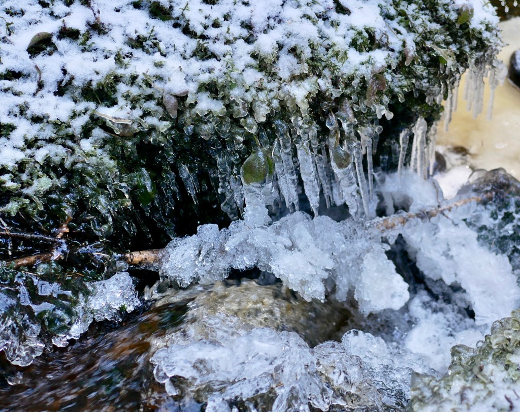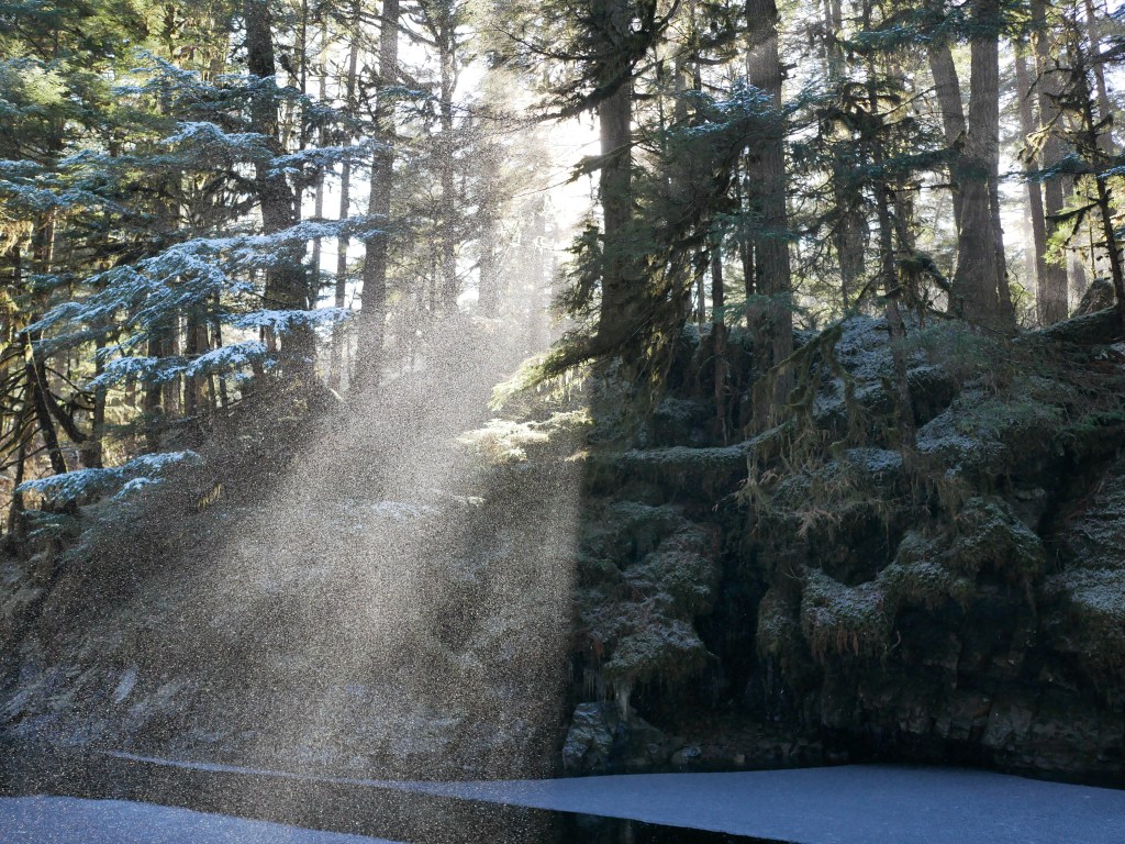 It’s too cold to risk continuing up the icy trail. But shafts of sunlight are backlighting the tree moss and illuminating normally dark parts of the streams. We push on for a half a kilometer until I slip and almost fall. Well little dog, it’s time to find a safer place to walk.