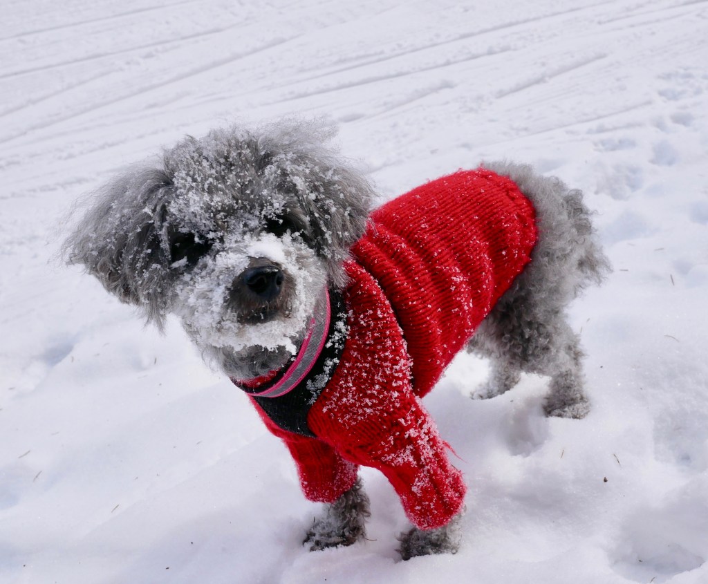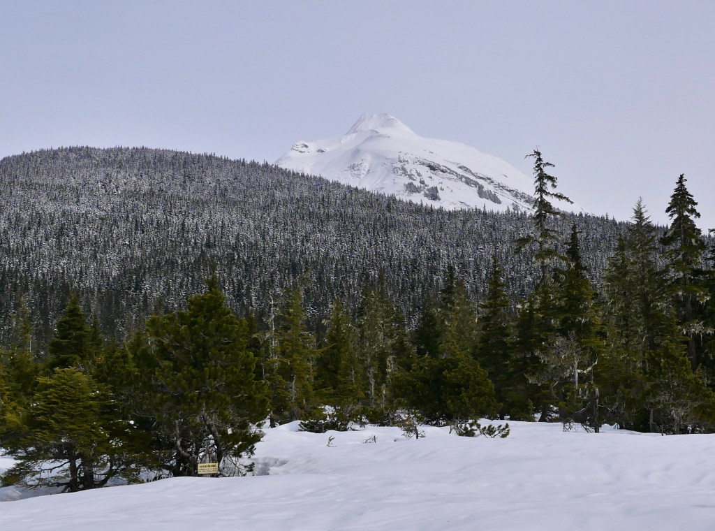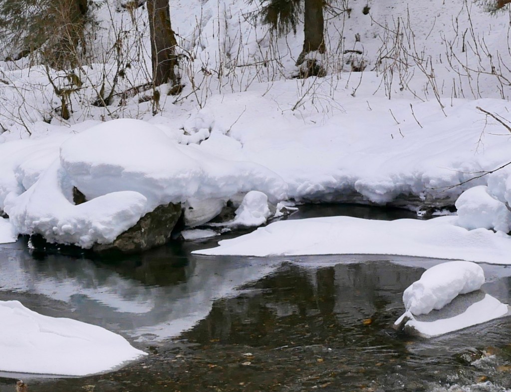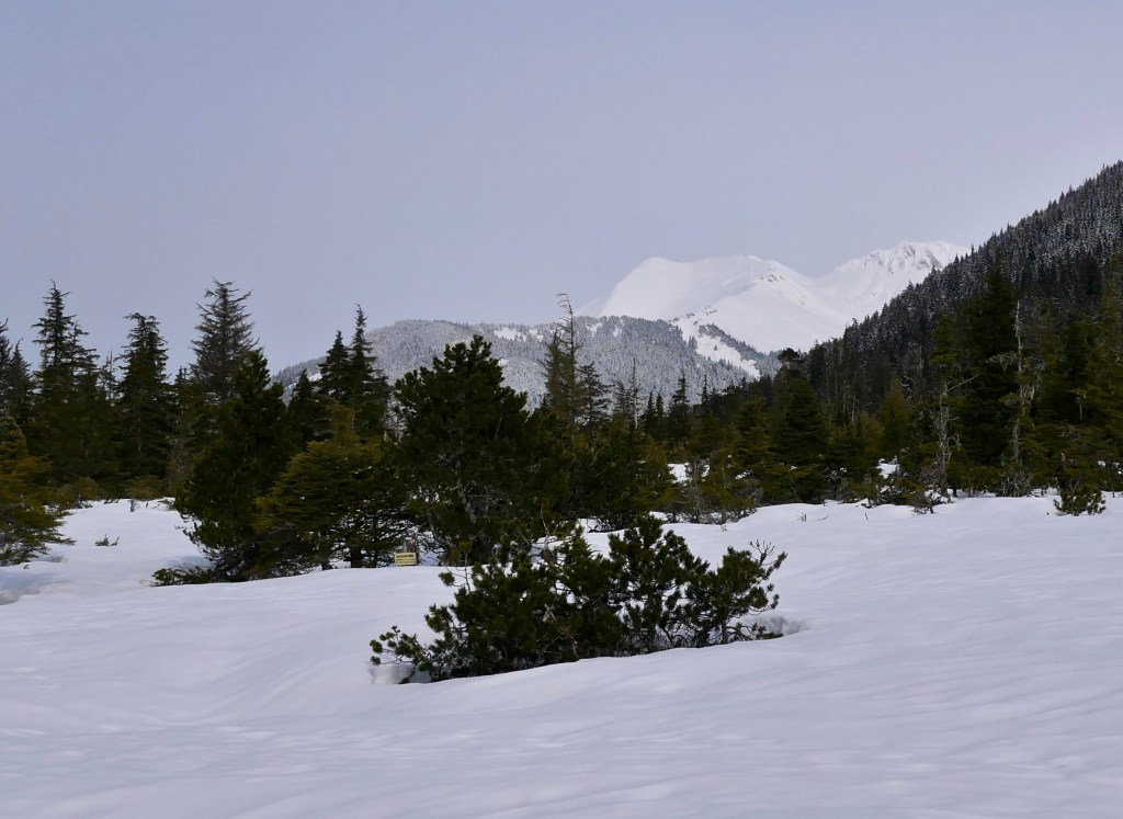 I pray for the riflemen to stop shooting long enough for us to put a half-a-kilometer between the gun range and Aki. But the firing continues. The little dog gallops alongside her humans as we ski down a series of small slopes to Montana Creek. A narrow bridge crossing the creek bares a pretty heavy snow load. Meter-deep mounds of snow cover rocks and the tangle of trees that have fallen onto the creek.