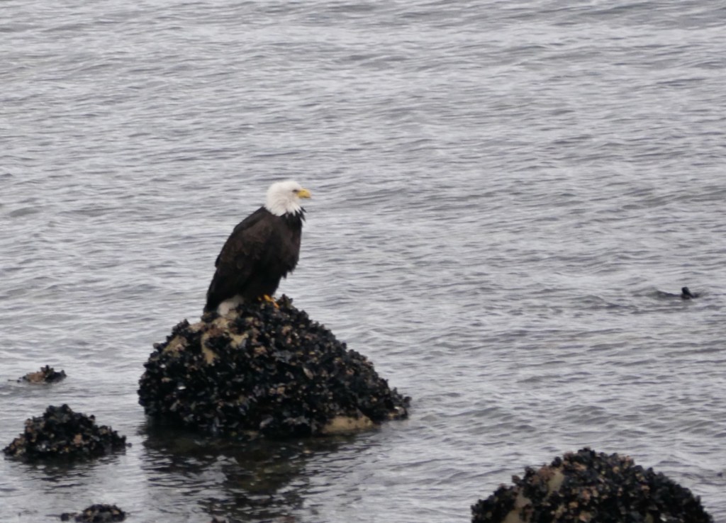 Something dark flashes on the bay’s surface and disappears. As I wonder whether it wasn’t an illusion, the thing reappears. Just as I identify it as a Dahl porpoise, it is gone. Aki and I are hiding from the rain under a picnic shelter. She’s had a good morning, meeting dogs and reading the pee mail. Me, not so much. Up until now, I’ve had to be content with sightings of three golden eye ducks and a handful of mallards.