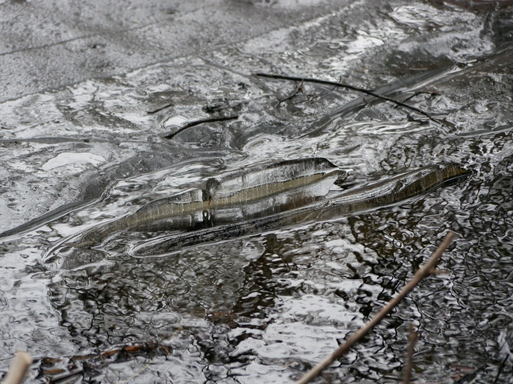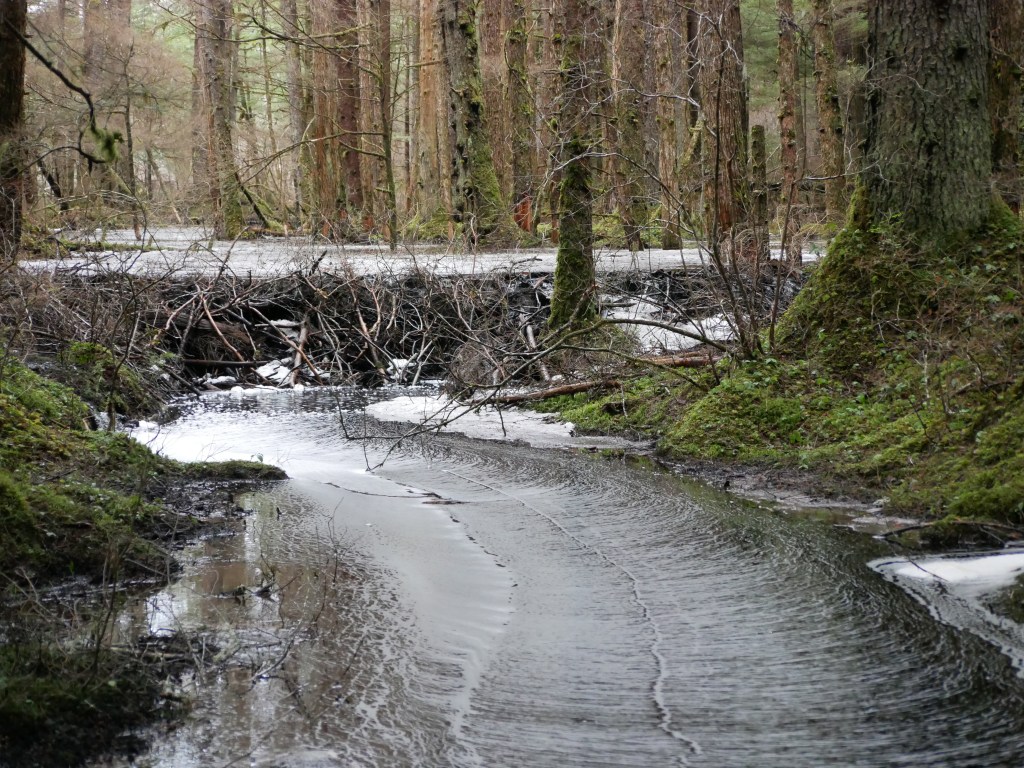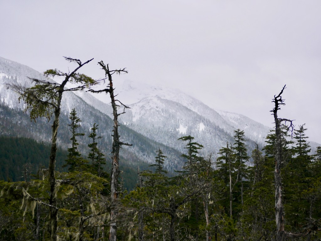 Aki starts whining, making it clear that she is not onboard with my plan to wait for the porpoise to resurface. I ignore her for a minute and then give in. We will never see the porpoise again. The walk back to the car makes up for the porpoise disappointment. No snow covers the trail, except where there are breaks in the thick old growth canopy above it. These patches stand out in otherwise dusk-like forest, like strips of dayglo paint. An eagle screams interrupts the song of an unseen sparrow.
