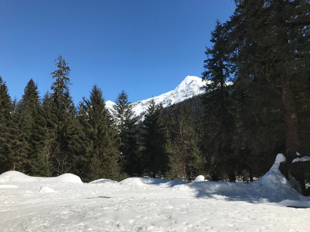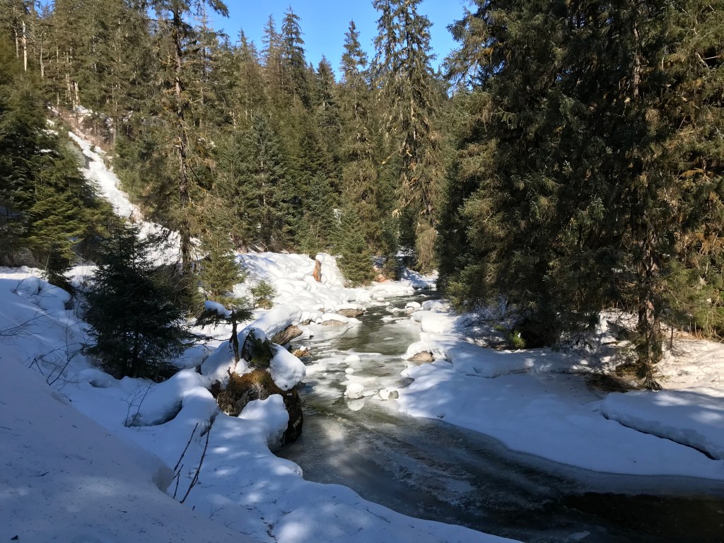 I’d expect more unpleasantness in hell. But for a cross country skier, Montana Creek might be offering a taste of purgatory. Aki wouldn’t agree. She is having a great time racing back and forth between her other human and me. Already forgotten is the first half-a-kilometer of the trail where blasts from the gun range made it impossible for her to hear my calming words.