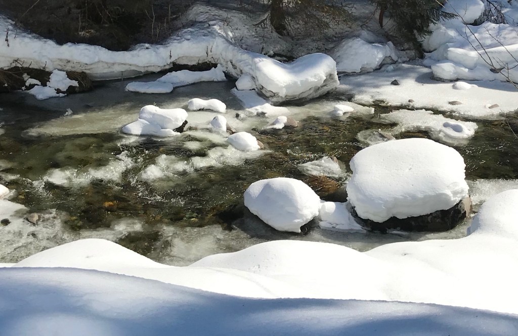 When the grade flattens out, the shushing sound of the snow-thaw stream will calm me. I’ll notice its beauty. The meter-deep mounds of snow that cover every rock and log in the creek are shrinking. Some have been reduced to a rime of ice that covers the round rocks like a short-cropped wig. Little falls of melt water pour from beneath each surviving snow mound.