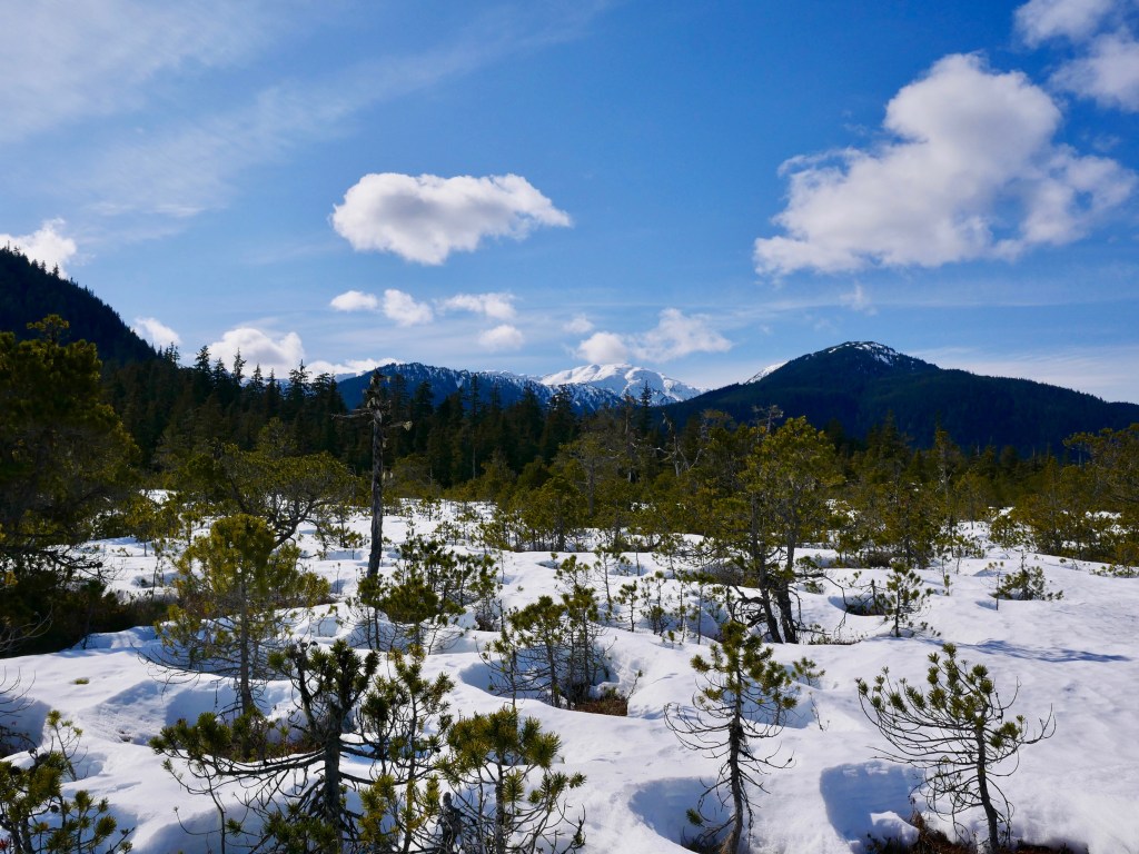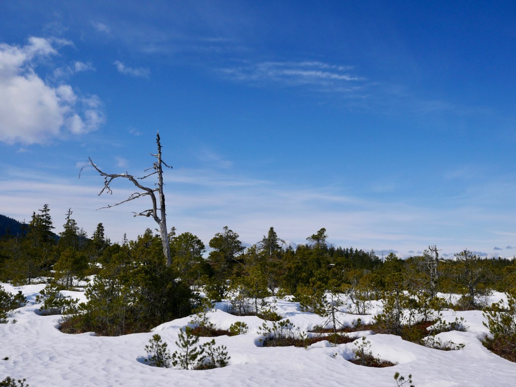 Aki trots ahead of me on an expansive meadow. Her tiny tracks in the snow could have been left by something wild. Spring is finally winning its annual battle with winter. To be fair, the sun is the main agent of change. Its rays warm the trunks of the meadow’s pines, which radiate heat to melt the surrounding snow, forming concave-shaped pots for each tree.