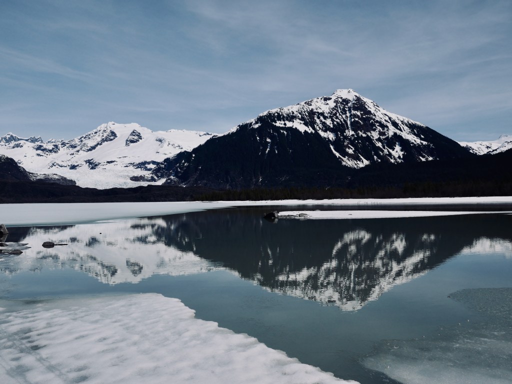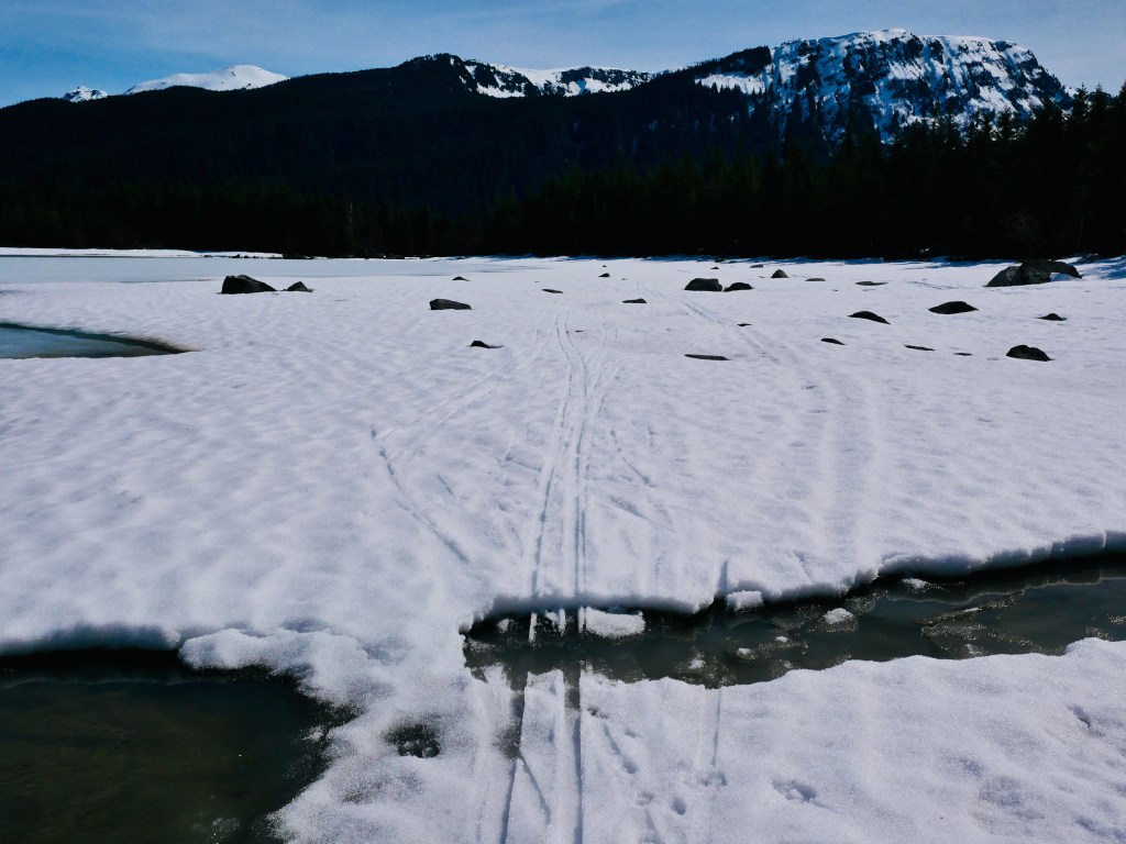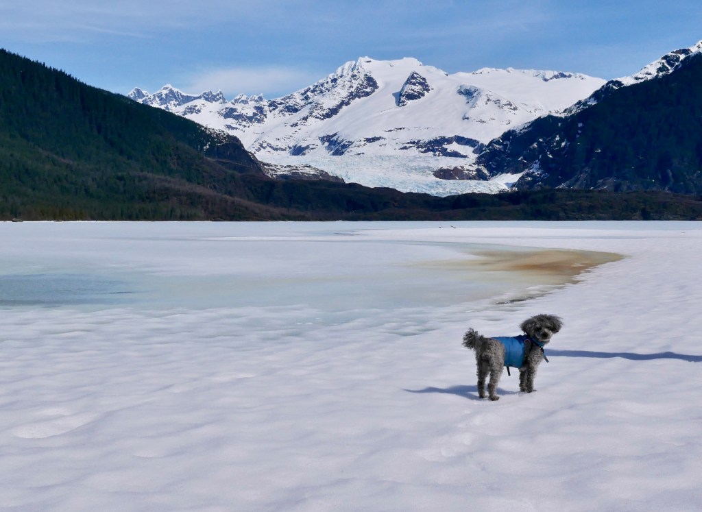 Wondering if we can ski all the way to the river, I lead Aki past Skater’s Cabin and onto the still-snow-covered beach of Mendenhall Lake. The snow is softer than yesterday but still firm enough for skiing. Like yesterday, we have the place to ourselves.