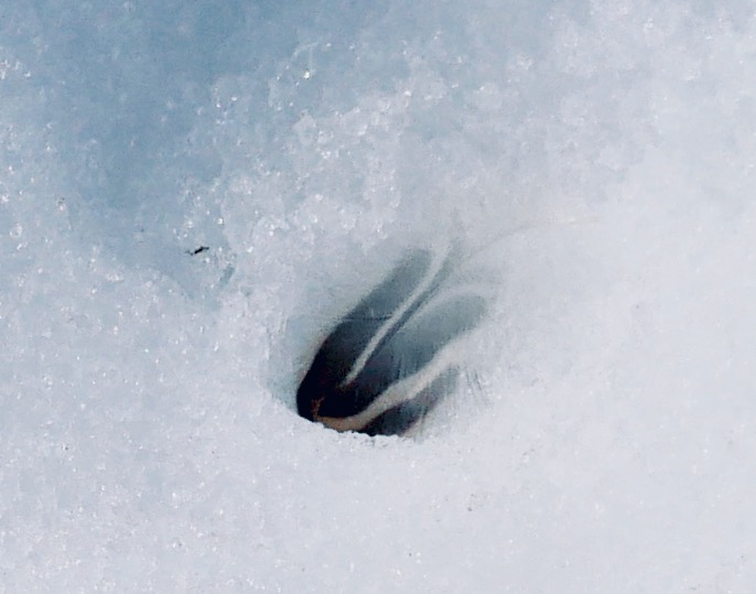 We pass divots in the snow formed by light, fallen objects rather than rocks. Sun heated things leaves, feathers, and tangles of tree lichen have melted the snow where they came to rest. I remember visit I made this time of year to Grayling on the Alaskan portion of the Yukon River. An Athabaskan man was scattering wood stove ash onto a bulldozer sized patch of snow. When I asked him why, he dug down until he struck the yellow-colored cab of a small Caterpillar earth mover.