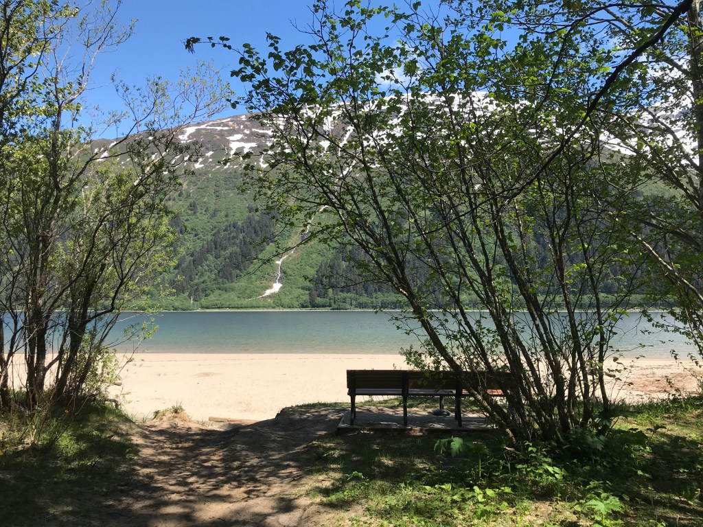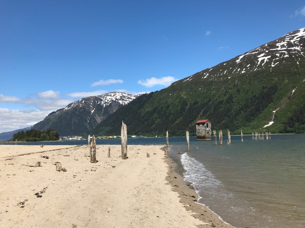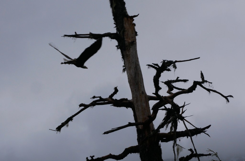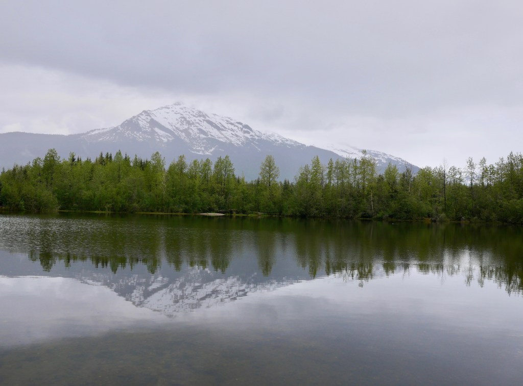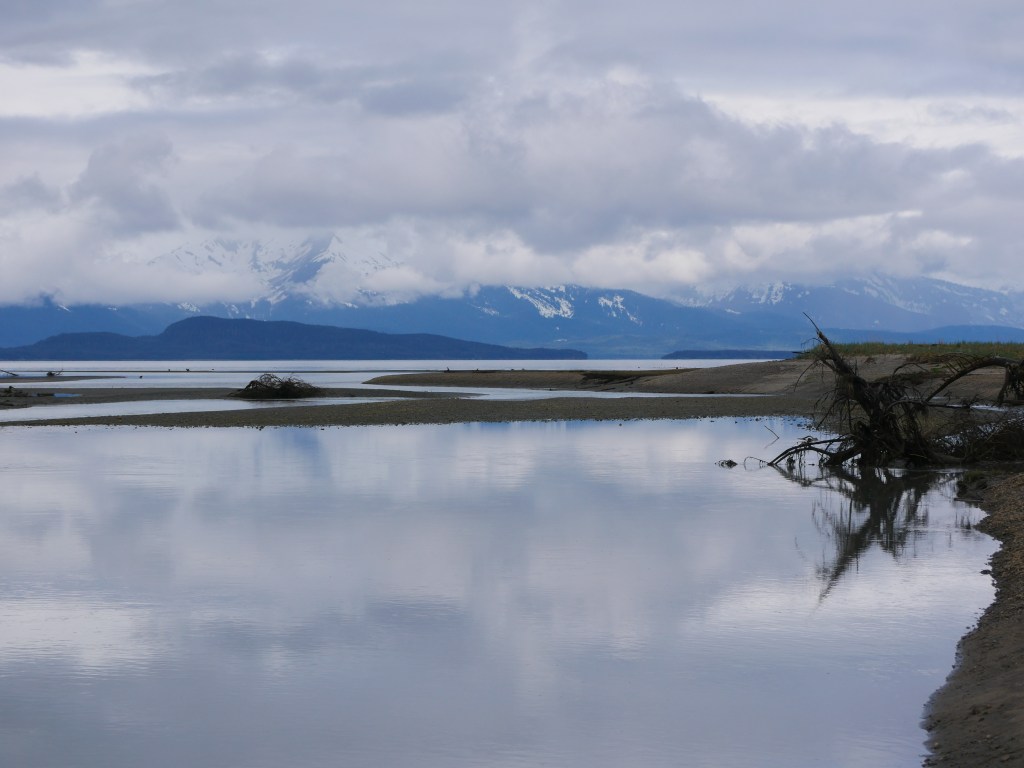 Crows announce my progress to the mouth with harsh calls. Across the creek, one of the resident bald eagles calls back. A slight breeze tosses about Aki’s fur when we reach the creek mouth. The little dog wades into the brackish water and sips. Behind her, a rising wind turns the glacier’s reflection into an Impressionist painting.