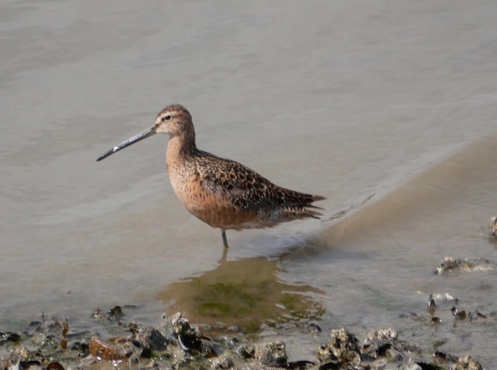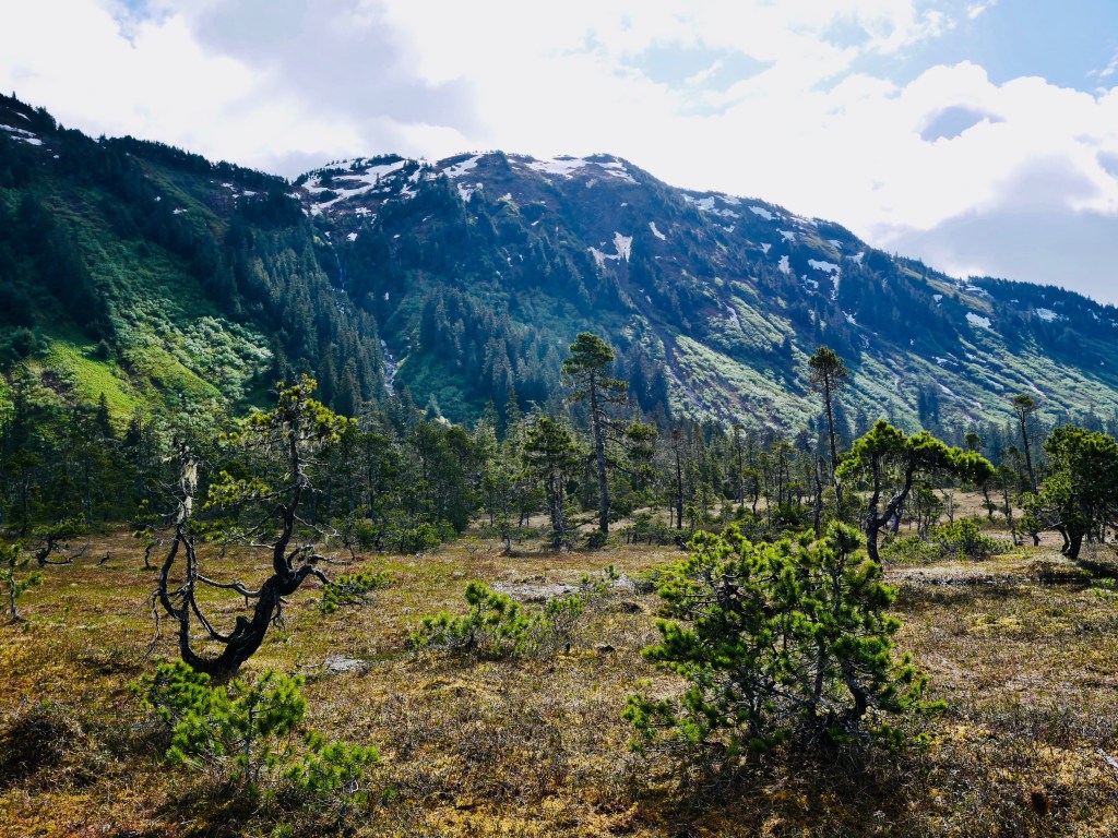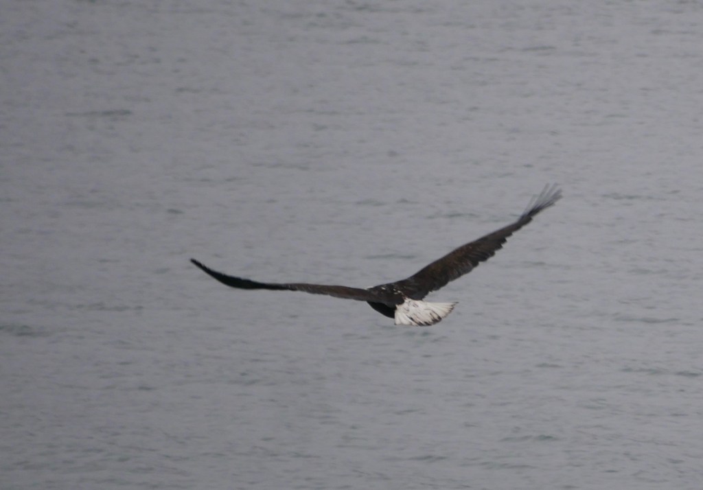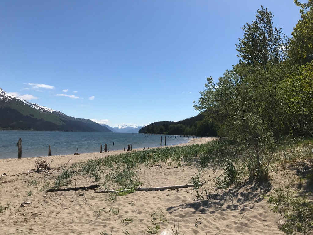 Crows announce my progress to the mouth with harsh calls. Across the creek, one of the resident bald eagles calls back. A slight breeze tosses about Aki’s fur when we reach the creek mouth. The little dog wades into the brackish water and sips. Behind her, a rising wind turns the glacier’s reflection into an Impressionist painting.