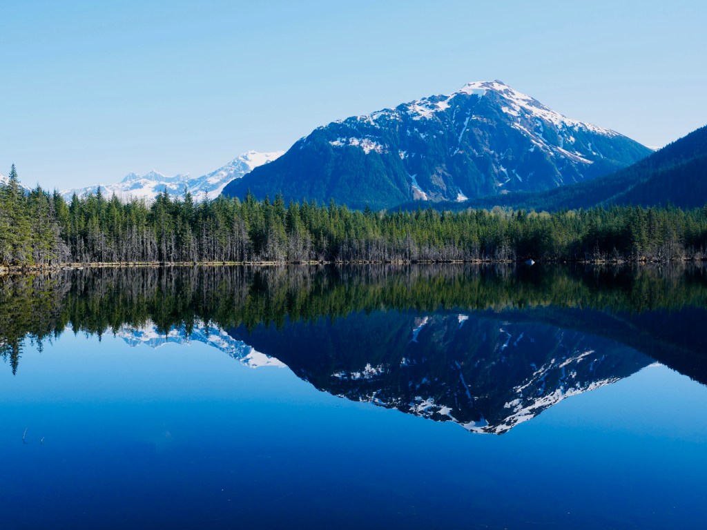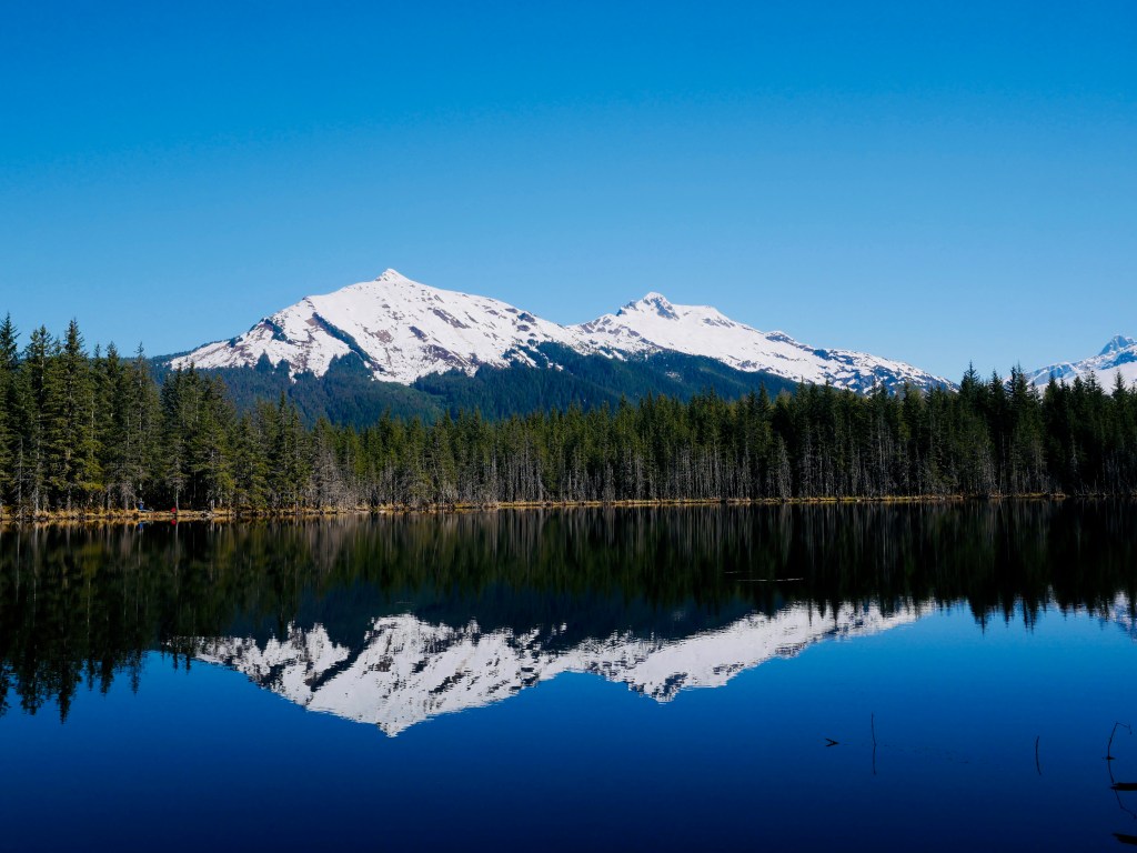Usually sunny weather brings the wind to riffle the Troll Woods lakes. But today, only the faintest breeze flows through the woods. Each lake is a crystal mirror reflecting mountains and glaciers.
