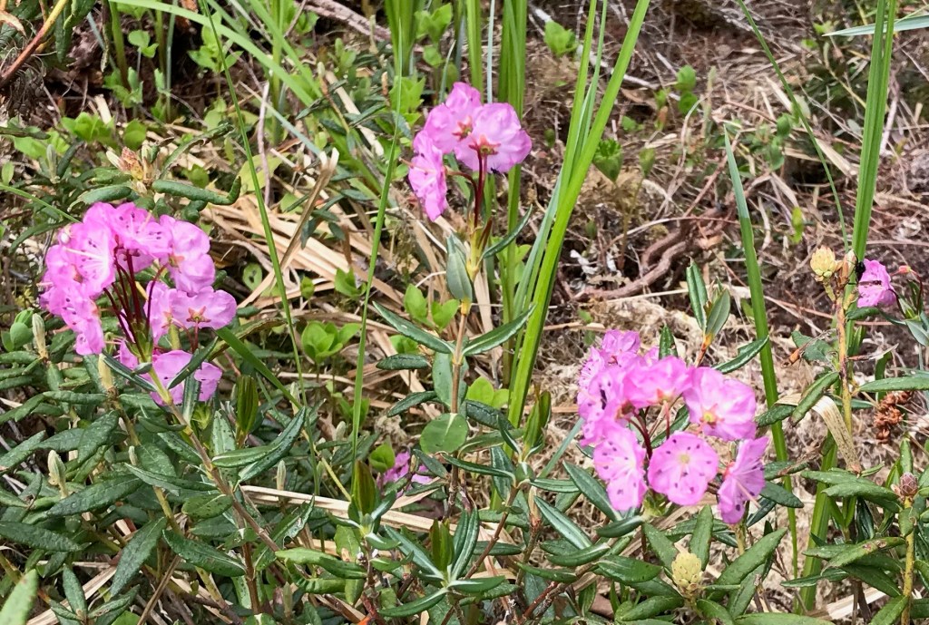 While holding Aki, I move a couple of meters off the Marriott Trail and stand in shallow marsh water. Seconds before we were walking on a dry gravel trail that cuts like a pencil line across a swampy meadow. A minute ago, I left the trail to photograph a clump of wild rhododendrons, returning to see a family of four approached us down the narrow trail.
