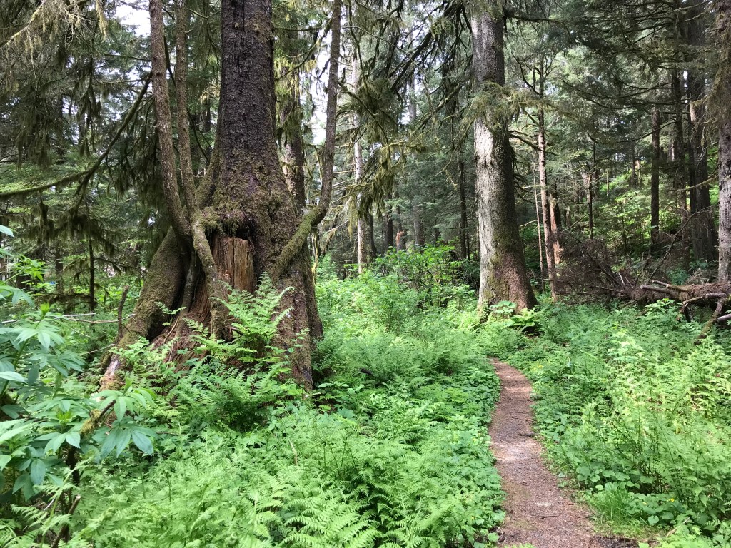 The trail takes us down a steep hillside to an unlogged creek valley. Spruce trees older than America grow along the stream. I once found the carcass of a bald eagle in this almost-untouched place.
