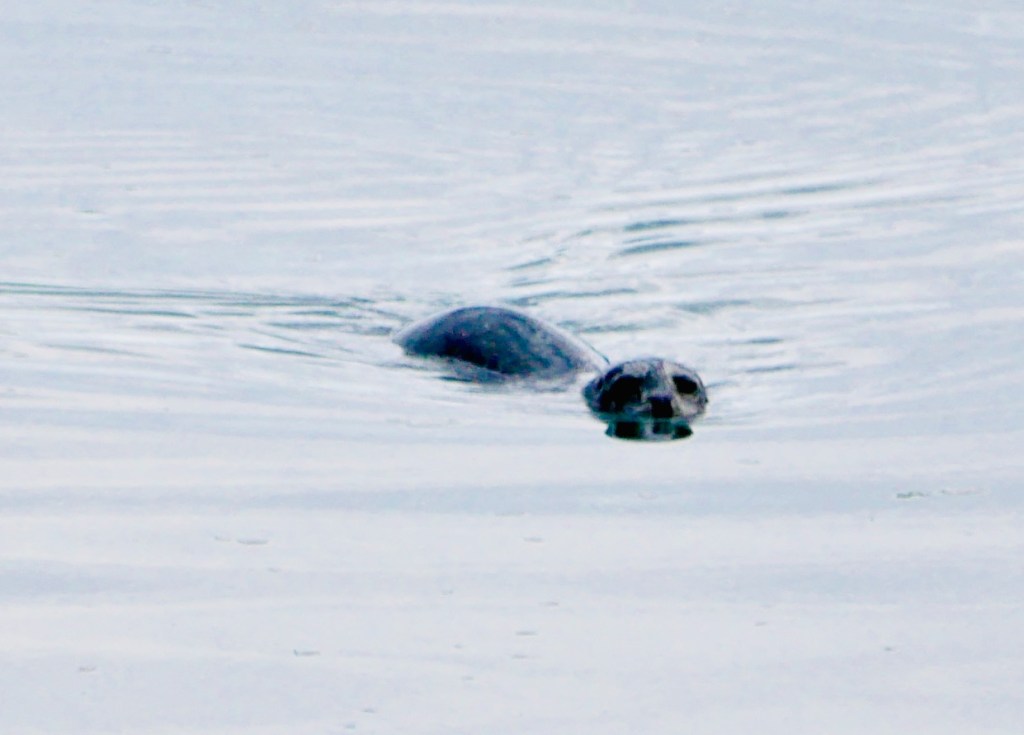 A seal splashes nearby while the little dog does her business. At first, I doubt that it is a seal. Normally, they never make a sound, even when diving on a fast-moving salmon. Just before it crash dives again, I make out the sad dog face of a harbor seal. Every minute or so, the seal surfaces for a second and then makes a splashy dive. When it spots me on the shore, the seal returns to stealth mode and moves quietly towards the little dog and I.