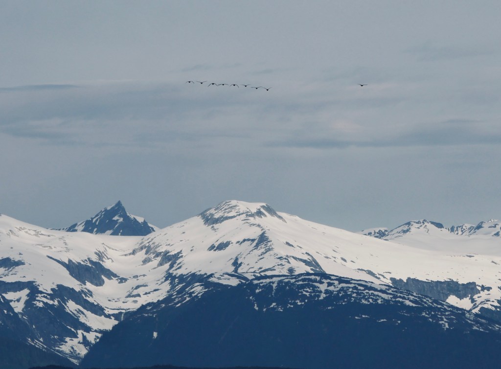 The panicked honking of Canada geese breaks morning silence. Coming from the direction of the beaver pond, a wedge of geese skim over the beach and fly toward the Chilkat Mountains on the opposite side of Lynn Canal. I wish that Aki and I had lingered at the pond long enough to have spotted the geese and witnesses the attack that drove them into the air.