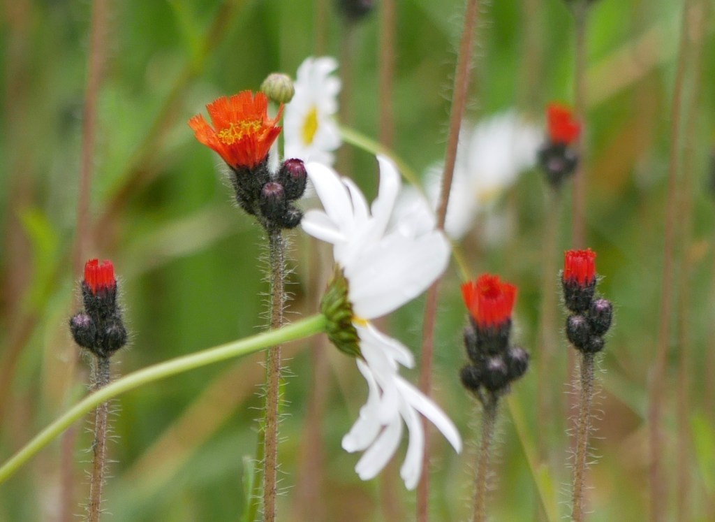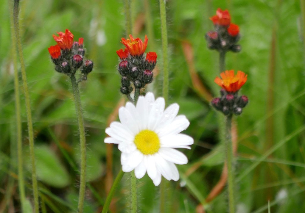 The red blooms of hawkweed and white daisy flowers color the areas once dominated by knot weed. Hawkweed is on the local list of invasive species and the cartoon-like daisies probably should be on it. Finding either plant thriving on a wild beach fringe would upset me. But here, on this manufactured park space, they just look pretty.