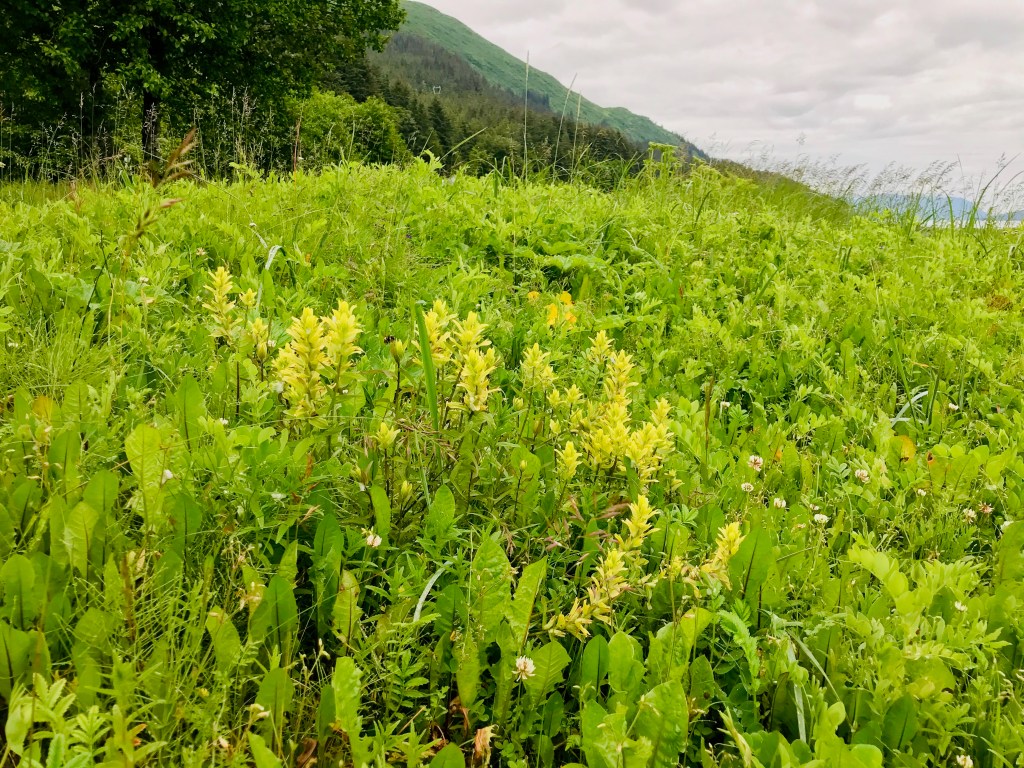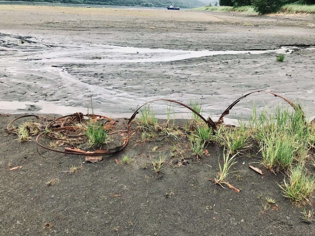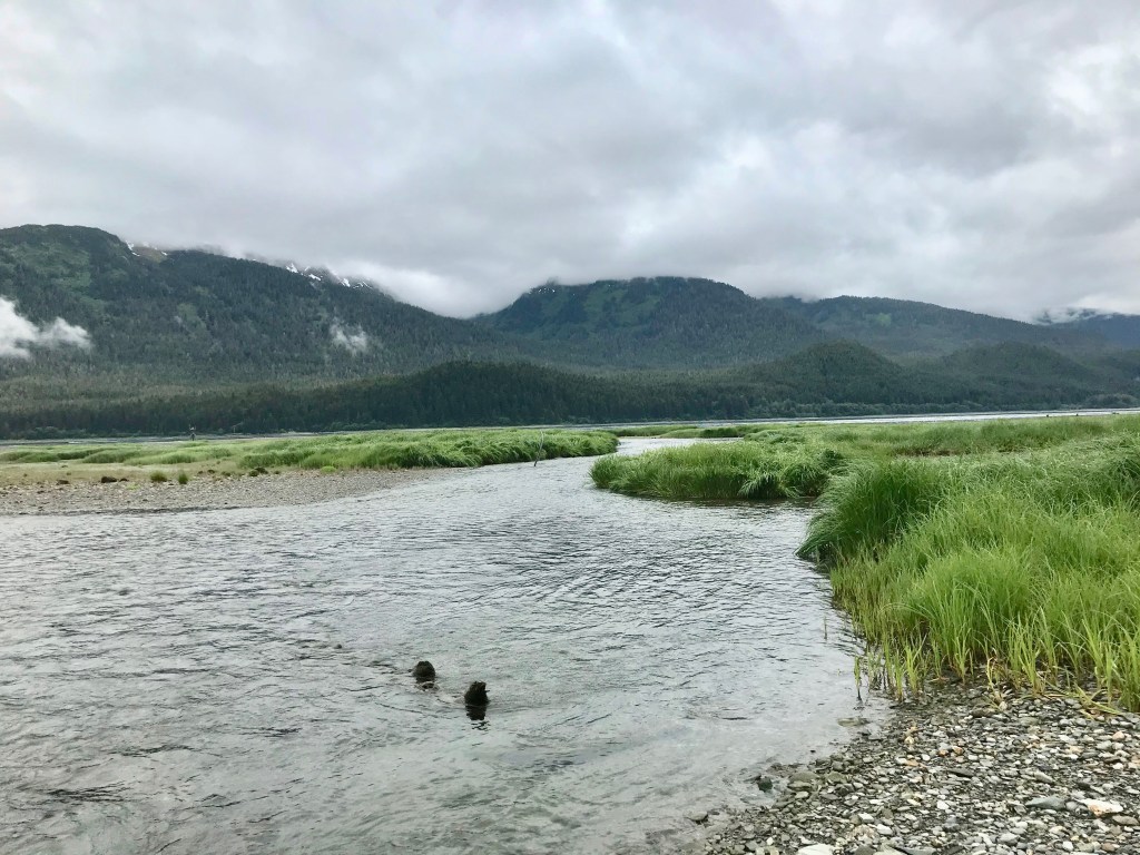 The waters of Sheep Creek look empty this morning. In a week or two, pink or chum salmon fight here for spawning space. Eagles and gulls will watch from the beach or while perched in nearby trees. Aki won’t be able to hear me over the sounds of gull shrieks. Now she can hear a whisper.