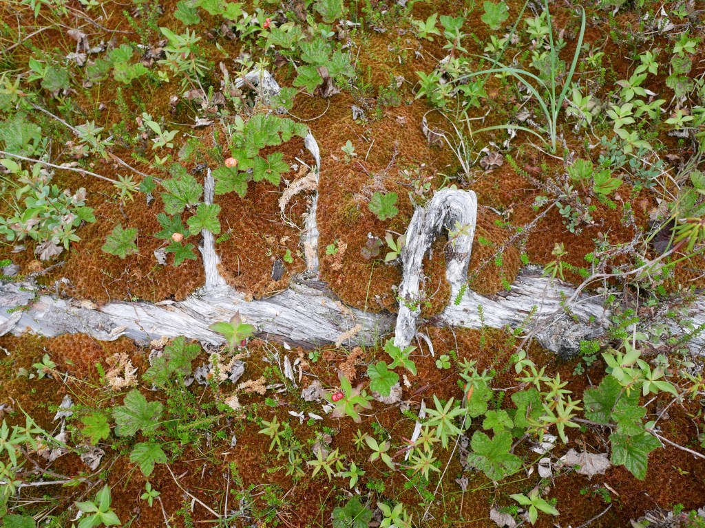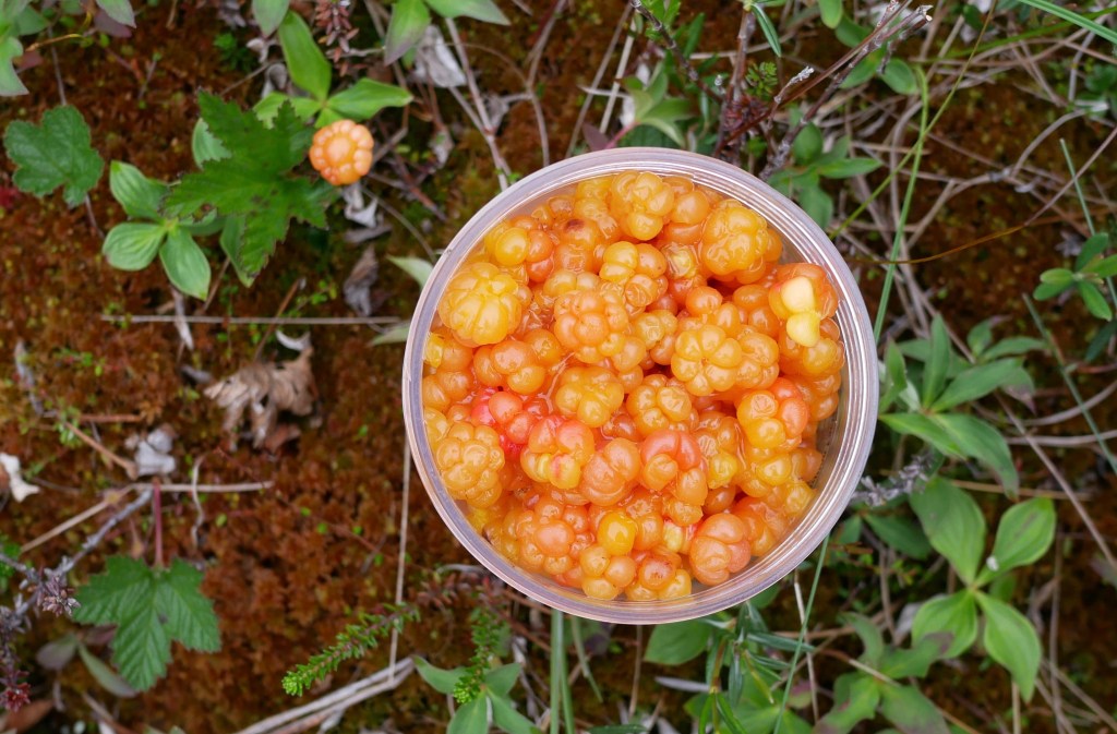 Cloudberries struggle to grow in this Southern Alaskan meadow. When Aki’s other human and I lived on the Tundra in Western Alaska, the locals called named them, “salmonberries.” Harvested by Yup’ik families, salmonberries provided essential vitamins and nutrients all winter long. We pick them this morning, to enjoy their tundra flavors in our rain forest home.
