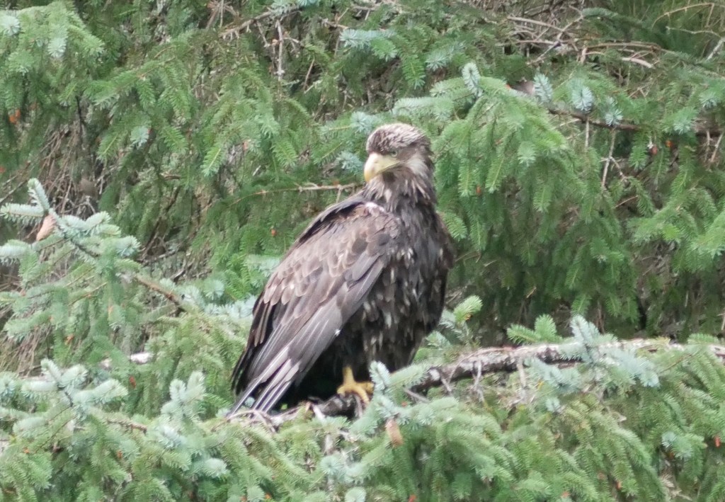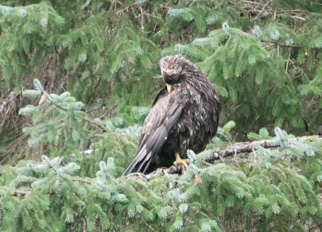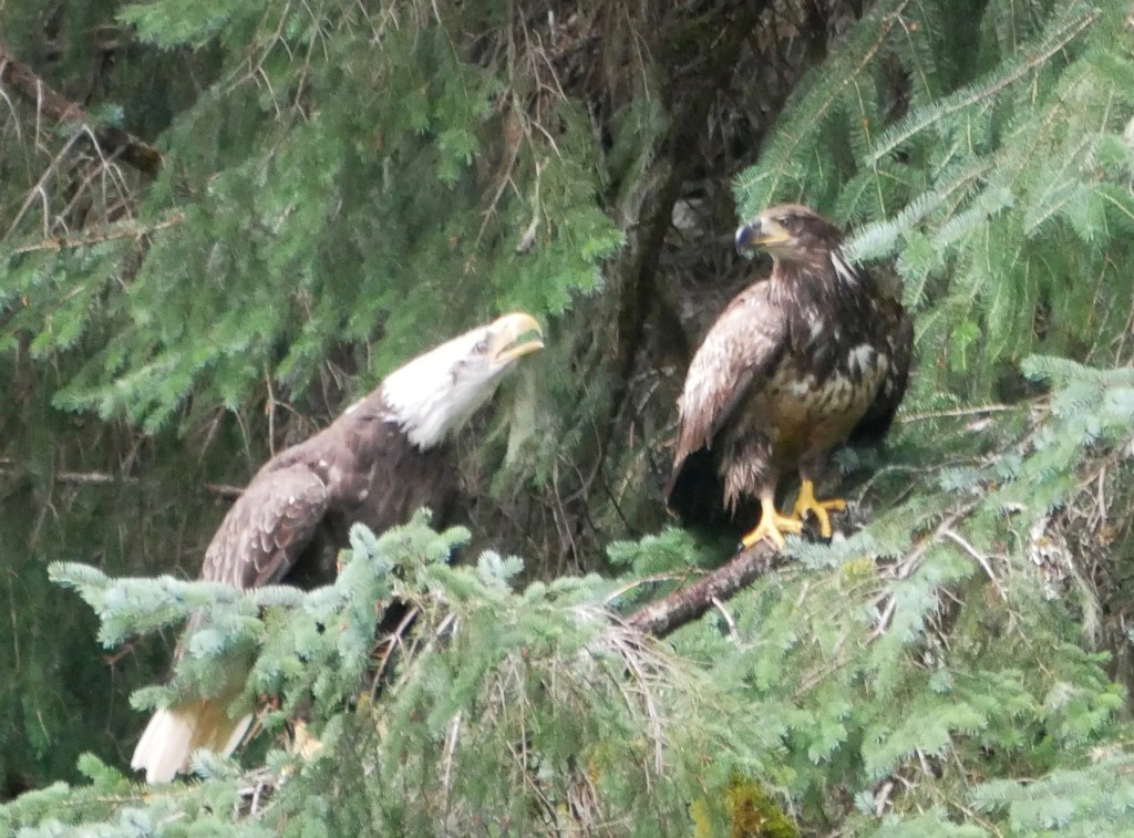 The white-headed eagle sounds as frustrated as I feel. An immature bald eagle has just almost crashed into it. The the chestnut-colored eagle slips into a sulk. Twenty feet away, another immature eagle casually grooms its wing feathers. Aki ignores all the noise.