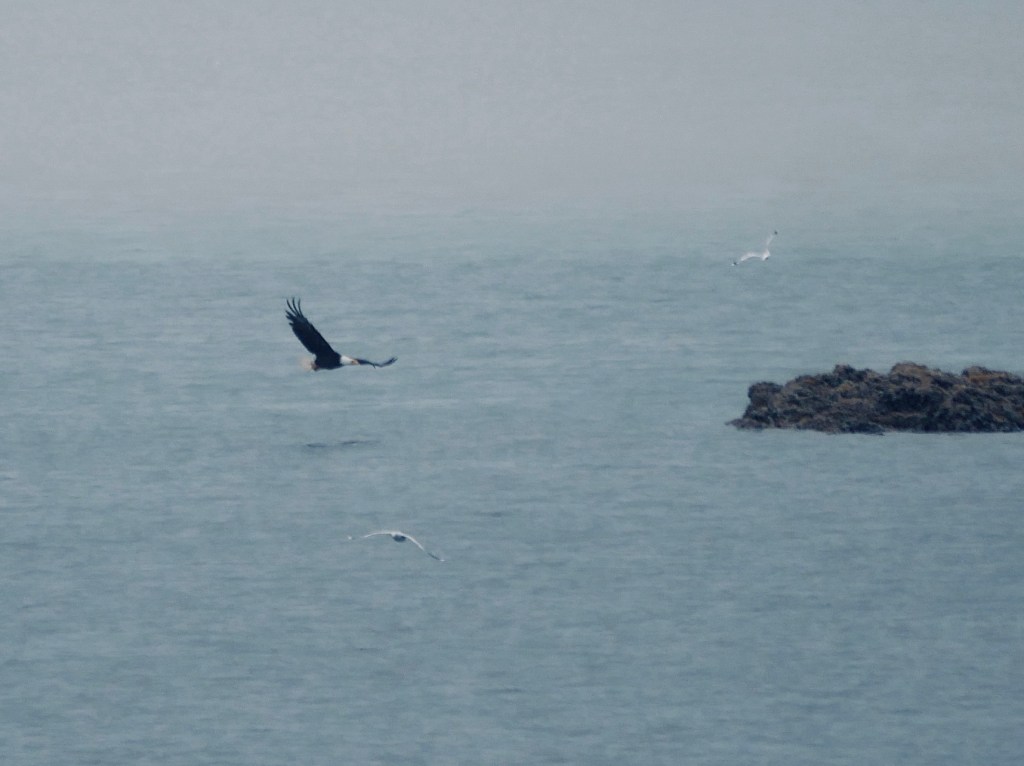 An eagle flies close overhead when we reach the beach. It cruises over to a little bay, circles and then drops with claws extended. After rising skyward with empty talons, it sets down on a rocky point, scattering a dozen gulls that had been lingering there. Eagles in groups of threes fly out to Shaman Island. Others find perches on recently exposed rocks. A raft of ducks fly between us and the island, over the head of two hunting seals. The salmon must be back.