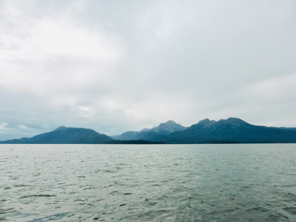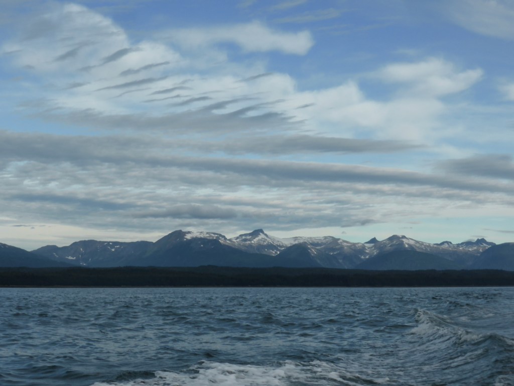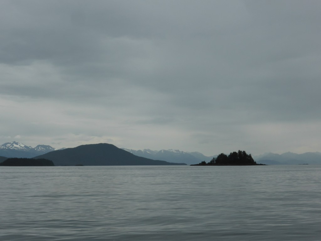 Thin lines of blue sky slice through the grey cloud cover as we leave the harbor. It’s calm, so no waves ripple the reflections in the harbor water. No other boats leave with us. In a half-an-hour our boat is slamming into waves. Just ahead we will face a nasty tide rip if we try to reach Admiralty.
