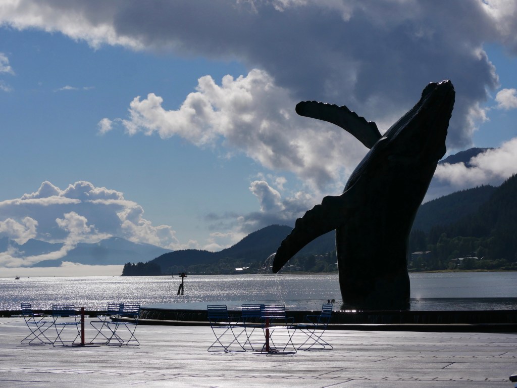 Excited by the unexpected appearance of the sun, Aki and I walk to the shore of Gastineau Channel, were the sculpture of a breaching humpback whale points to the blue sky. Two women with masks circling their necks talk while sitting in chairs six feet apart. A salmon seiner motors past them as it heads down channel to Taku Inlet.