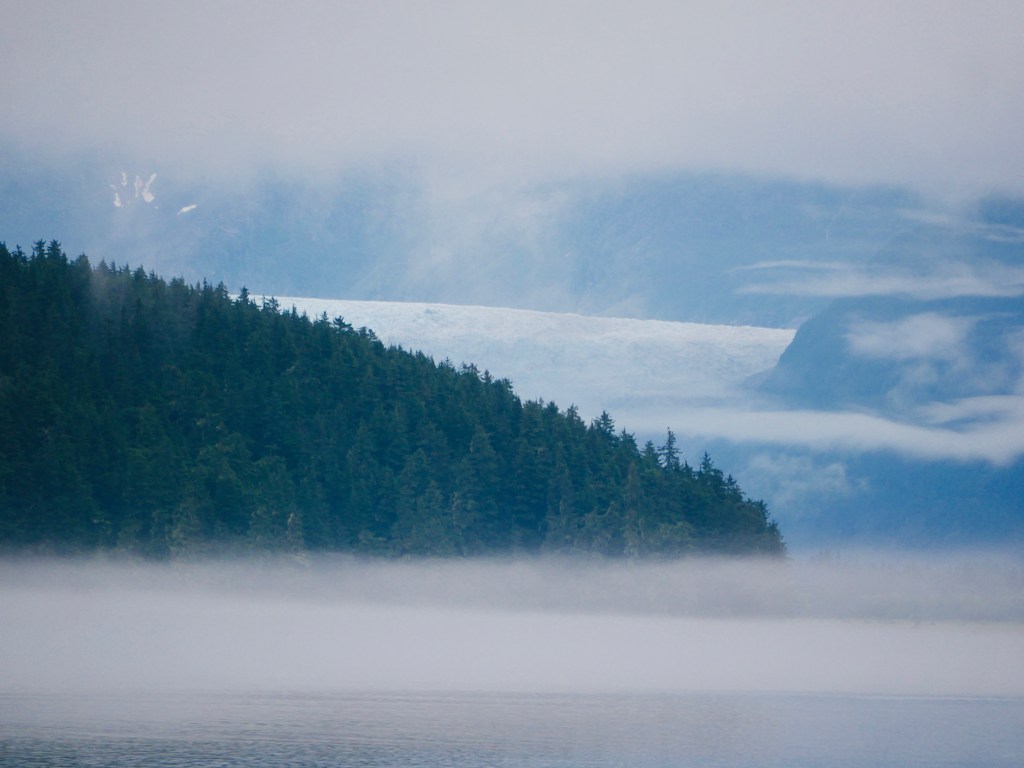 Rain can bring beauty as well as misery. Today it brings beauty with just a littler misery for the little dog and I. We are walking with another dog and her human along the Mendenhall River. Whips of fog curve around wooded islands and lay like a soft blanket over the grasslands.