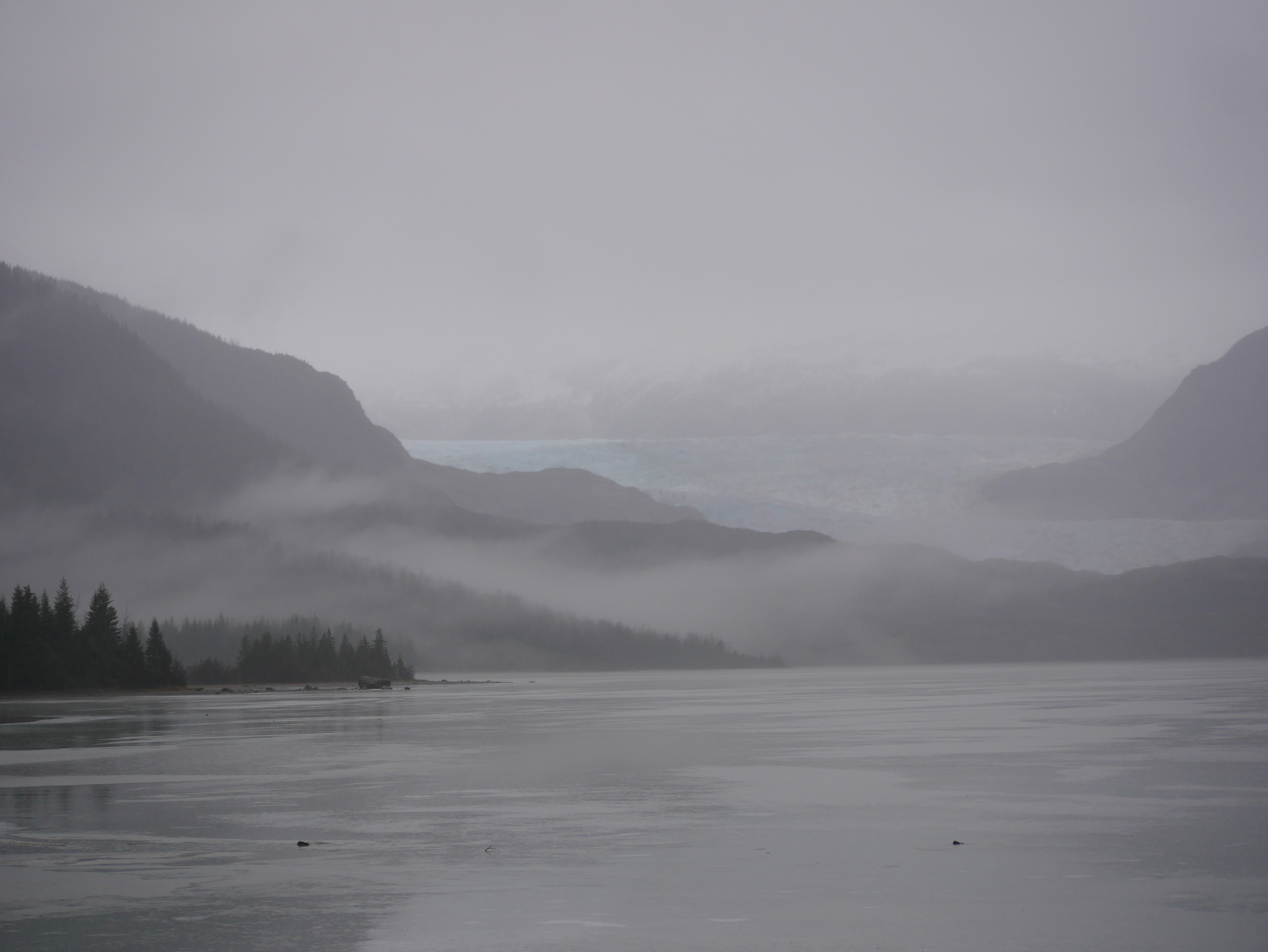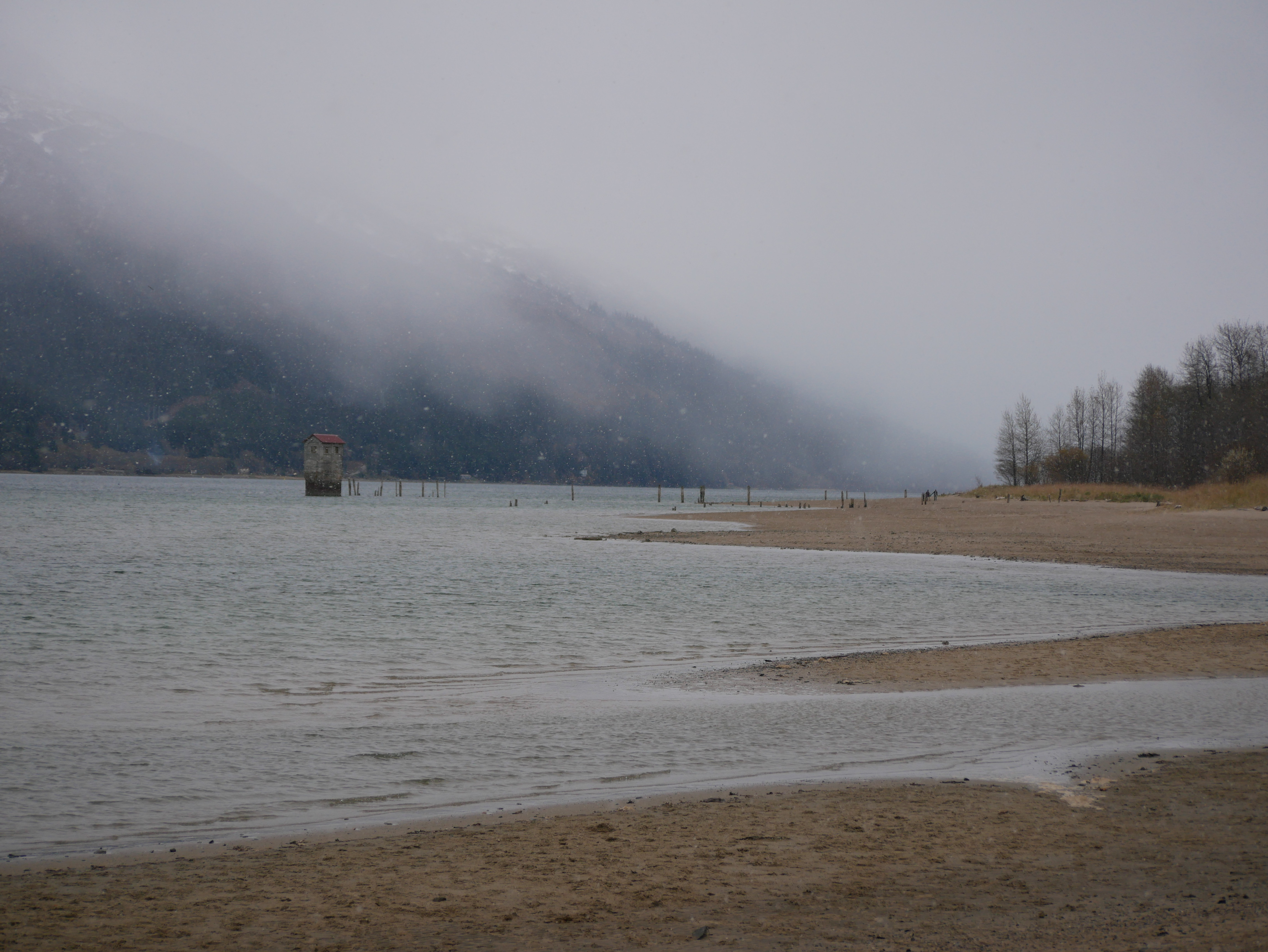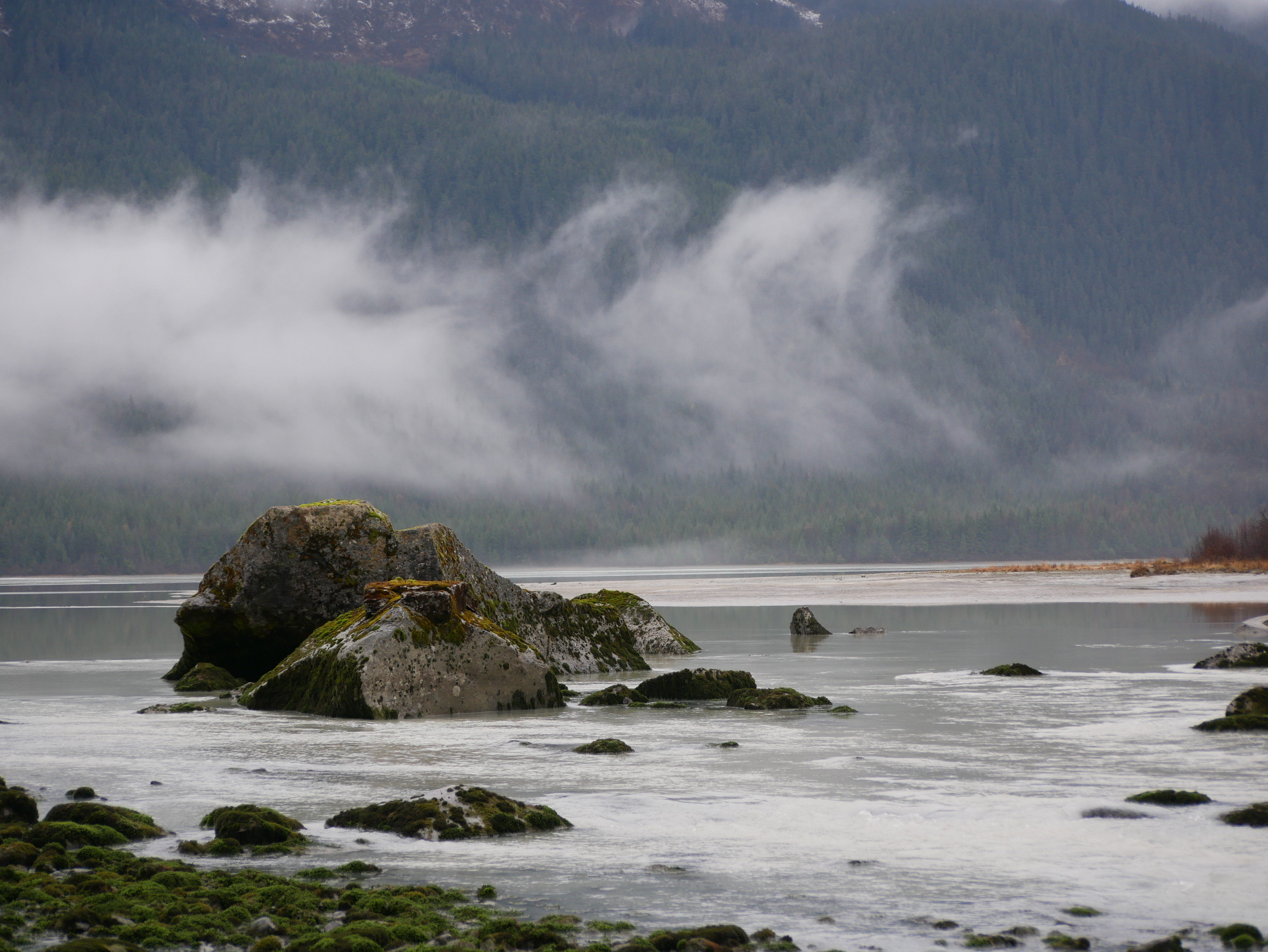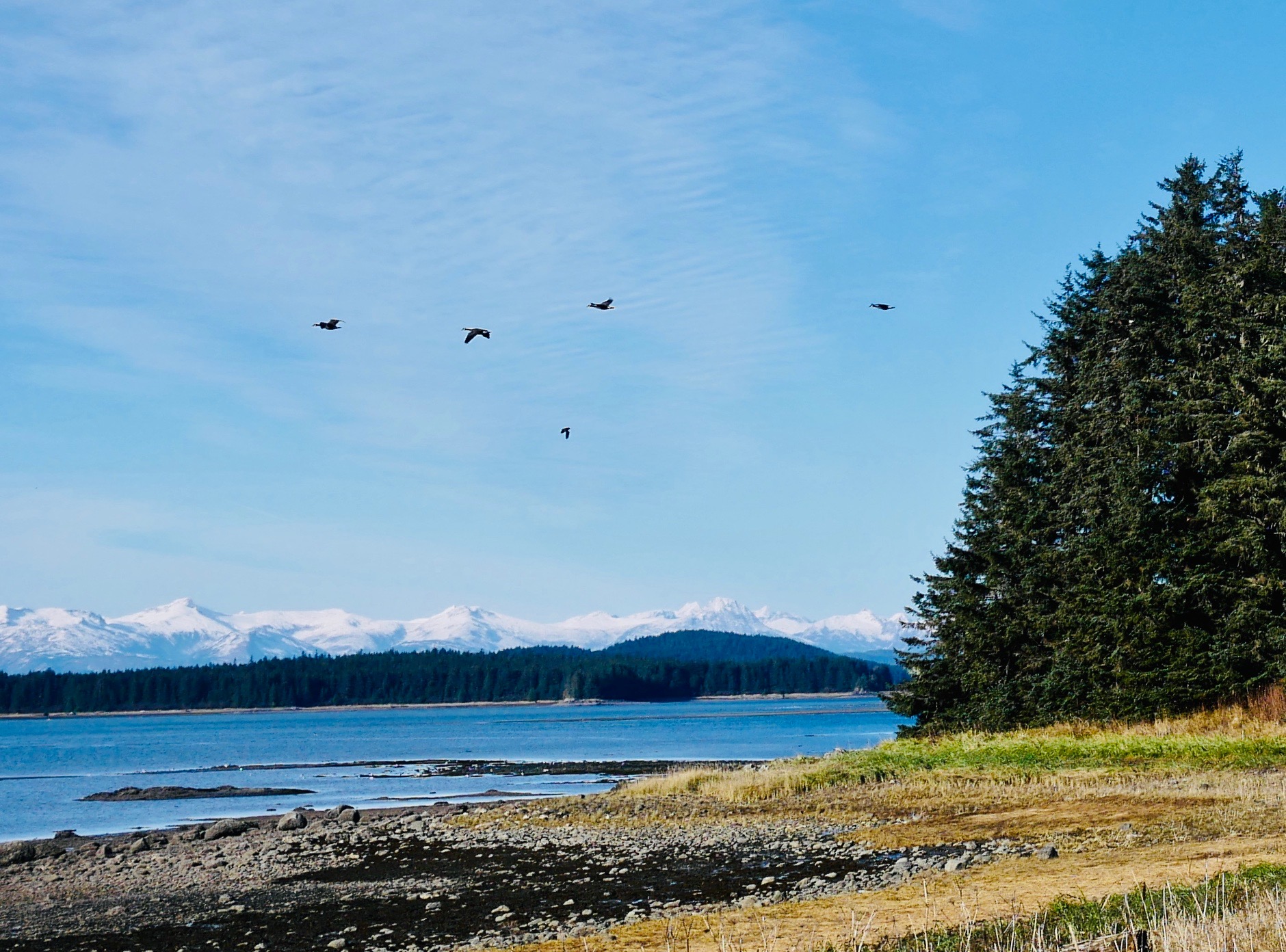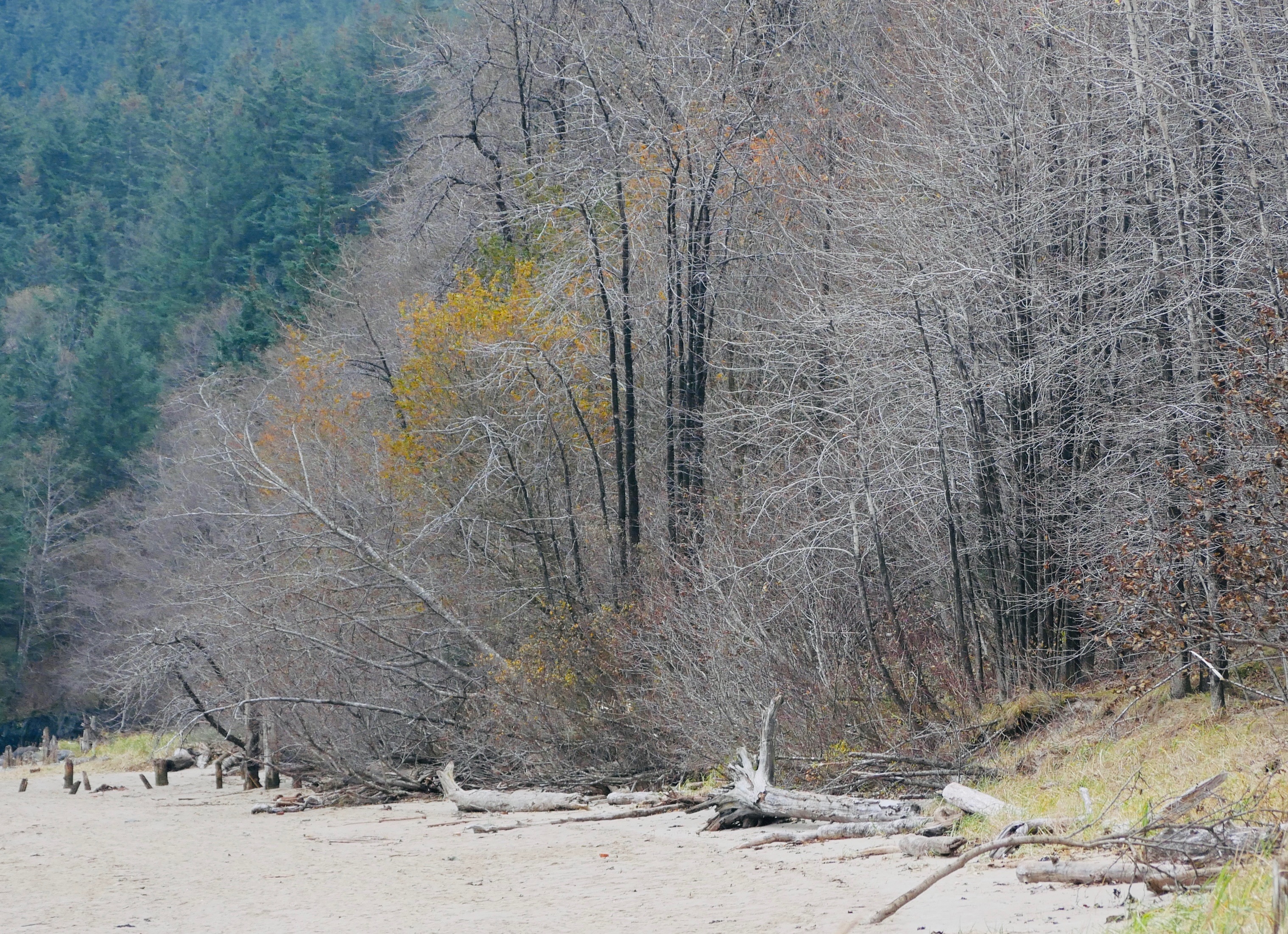 By the time we reach the beach itself, the golden eye contingent moves first toward the tip of False Outer Point and then paddles together into Fritz Cove. While Aki sniffs and pees, I search for piles of loose seaweed along the waterline. Most of the time I have to walk to the end of the beach before finding what I am looking for. After filing the buckets, I start up the beach for the car. Just before starting up the hill, I pass the golden eye pod, as they return to their beachside feeding grounds.