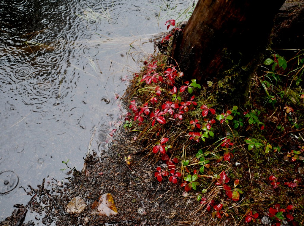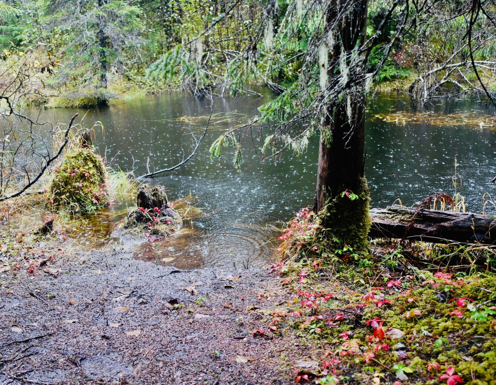 Okay. The trail is flooded. Every leaf is weighed down by rain. Aki doesn’t mind. She dashes up and down one of the few still-open trails, filling her memory with fading scents. She doesn’t notice that the surface of every little pond is shattered by rain drops.
