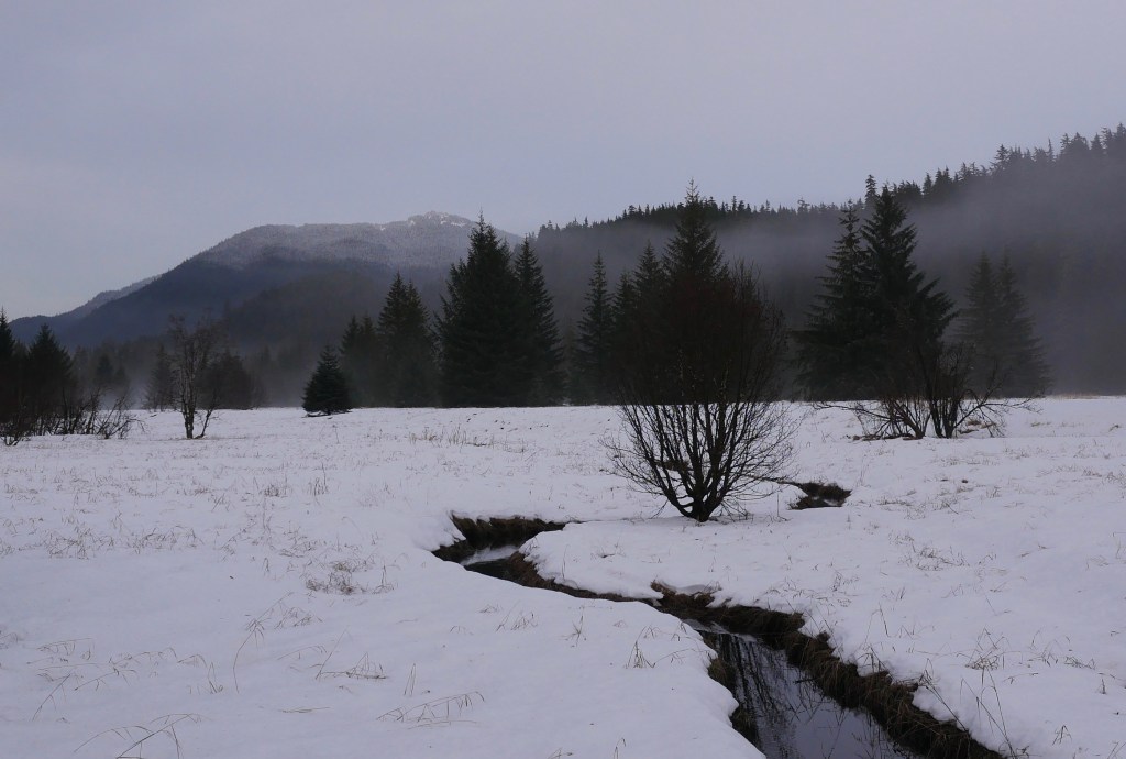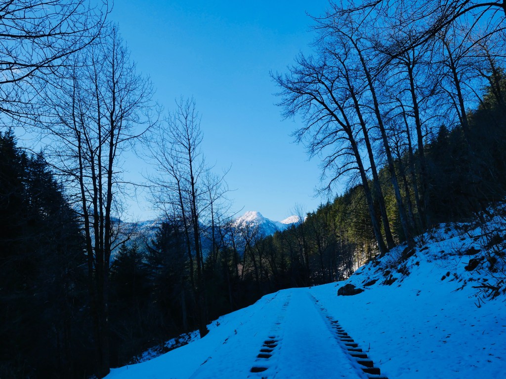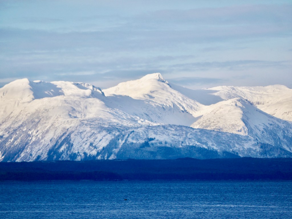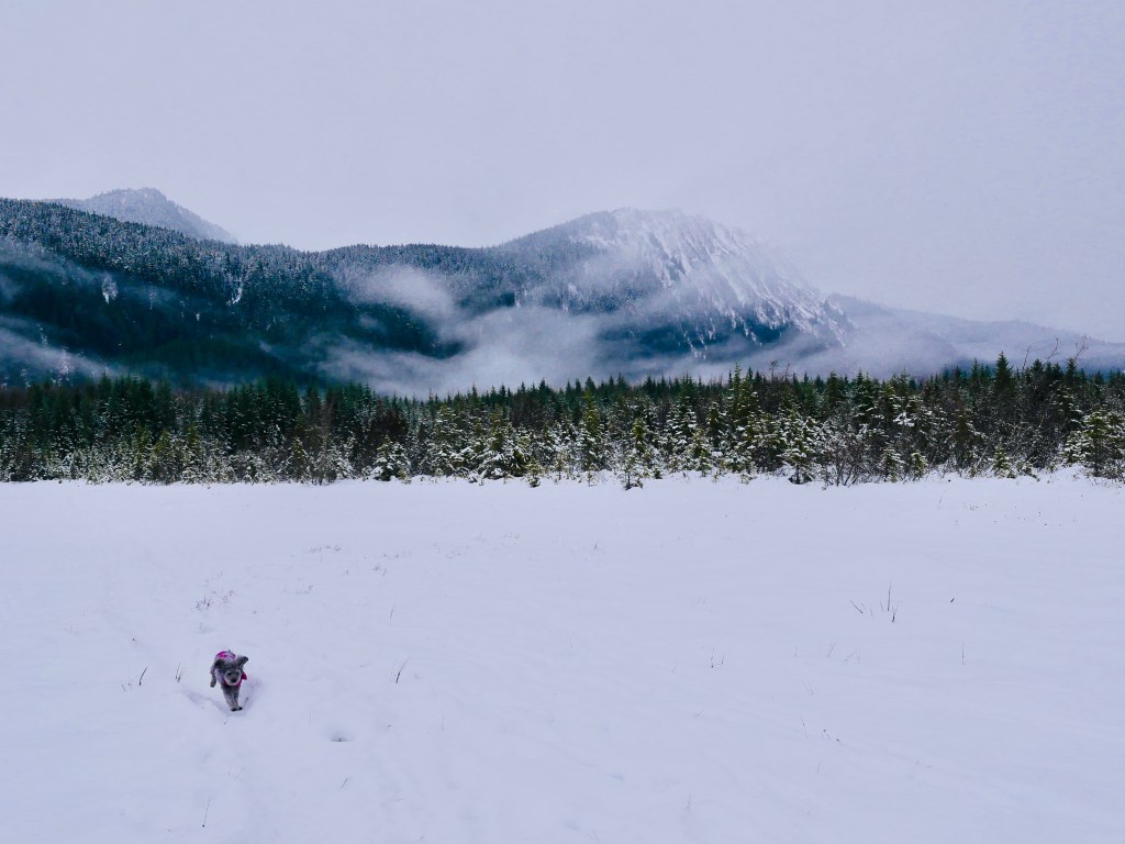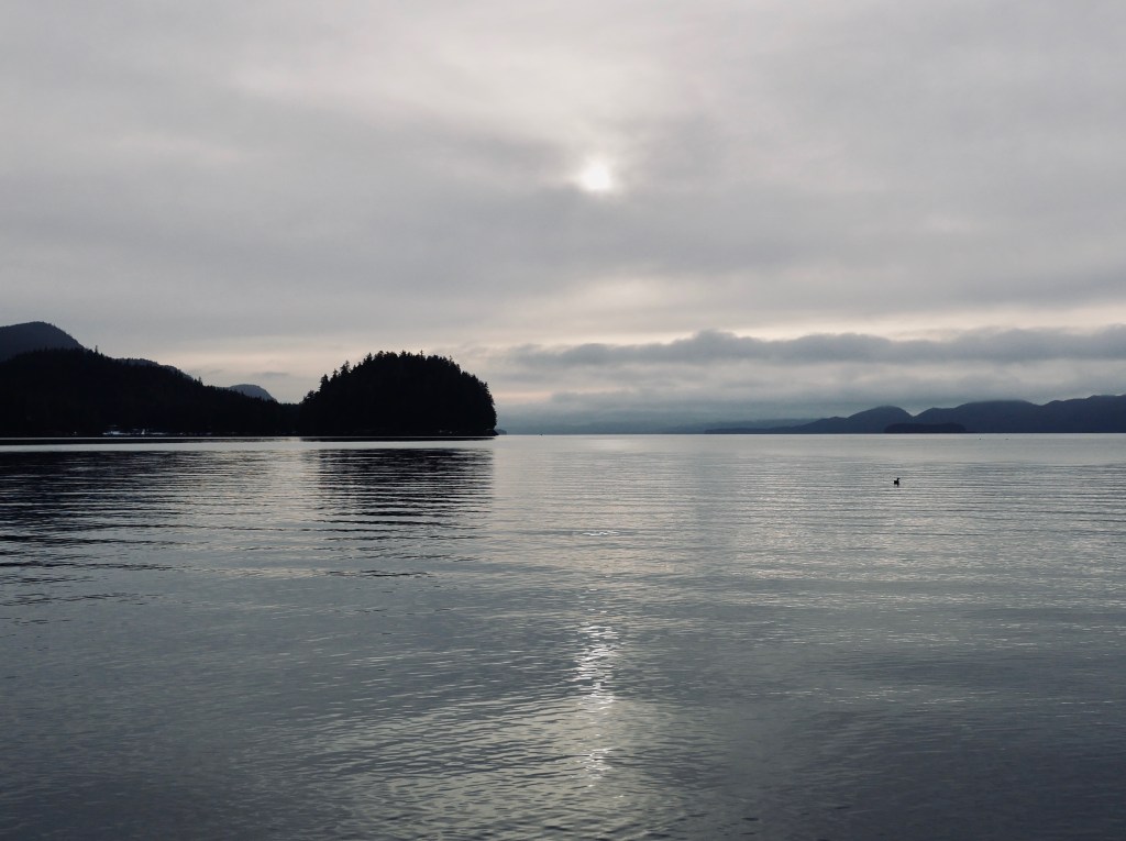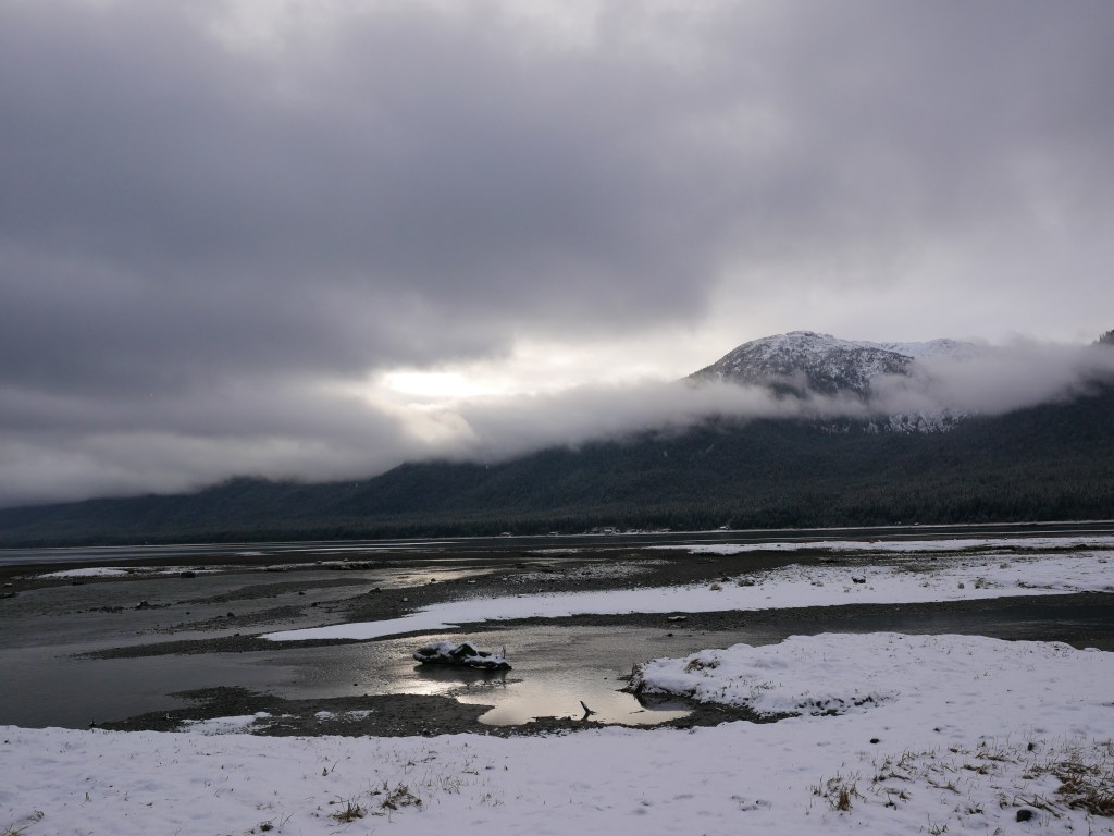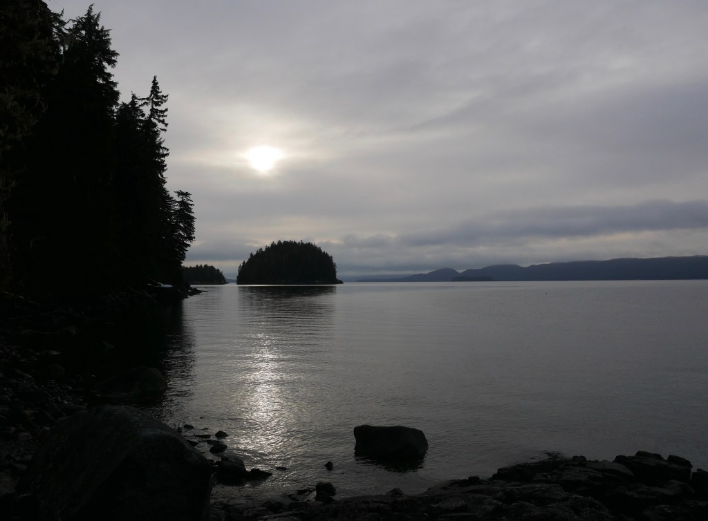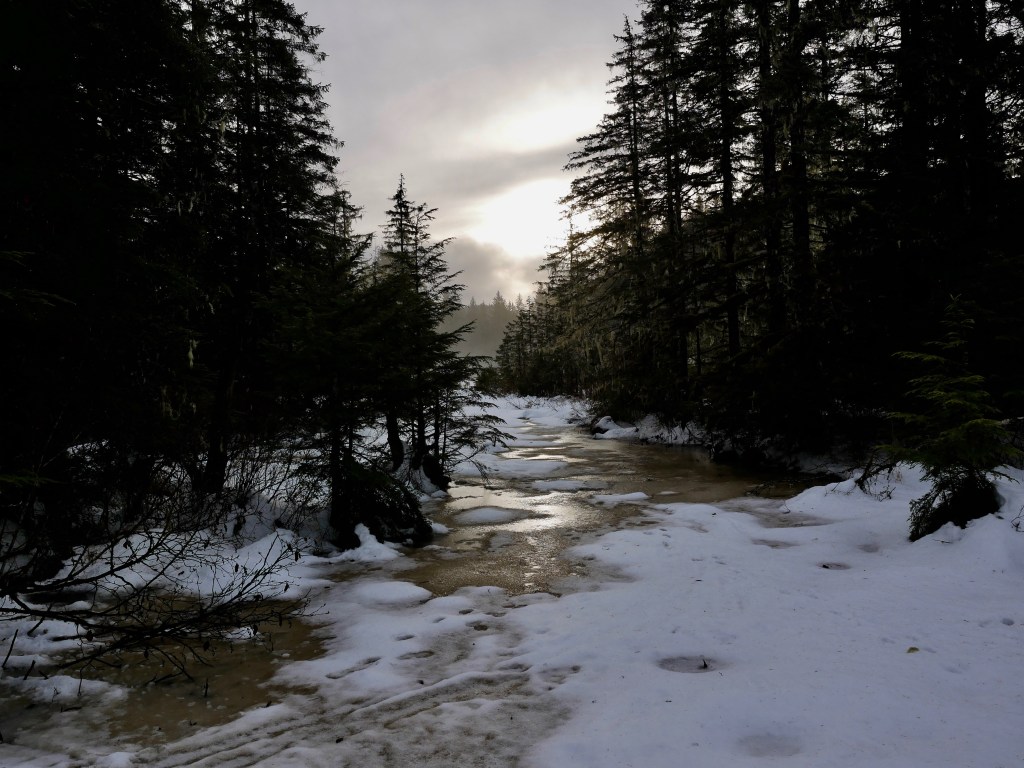 Every once in a while, Aki and I spot filtered sunlight through snow-burdened spruce trees. A full moon would cast more light in these woods. But hoping to see it reflected in salt water, I lead Aki to the beach. We have to be careful to move down the trail. I have to keep my eyes on the trail to avoid the dangerously icy bits.