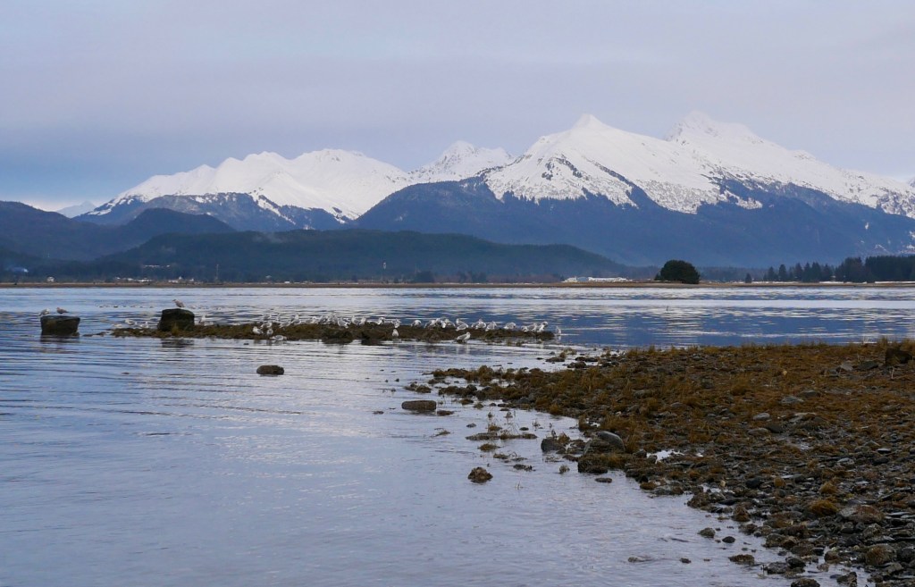 Aki lets me walk into the beach alone so she won’t inadvertently chase off any ducks. It’s a wasted effort. The place is empty until two gulls land near the beach. But we can still see a bit of the sun powering through marine clouds to reflect some light on a patch of the offshore water.